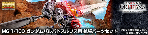 『機動戦士ガンダム 鉄血のオルフェンズ』より「MG 1/100 ガンダムバルバトスルプス」を更に楽しめる豊富なパーツがセットになって登場! ※「MG 1/100 ガンダムバルバトスルプス」は別売りです。 ※各形態を再現するためには当商品と組み立て前の「MG 1/100 ガンダムバルバトスルプス」(別売り)がそれぞれ必要です。 〈セット内容〉 ・眼光エフェクトパーツが付属 ・腕部ロケット砲は2門付属 ・ヴァルキュリアバスターソードは伸縮状態、ソードとメイスに分離した状態で再現することが可能。 ・MG 1/100 ガンダムバルバトスルプスに付属する武装パーツを組み合わせることで、様々な表現が可能に! ●劇中で印象的な右肩部の破損と左肩のエフェクトを新規造形で徹底再現 MG 1/100 ガンダムバルバトスルプスに破損肩をイメージしたパーツを選択式で組み立てることが可能。 ヴァルキュリアバスターソードは専用のハンドパーツと付属のディスプレイスタンドを使用してポージングが可能! ●新規デザインの水転写式デカールが付属! 破損頭部イメージパーツ/エフェクトパーツ一式 /ハンドパーツ一式 /補助用スタンド