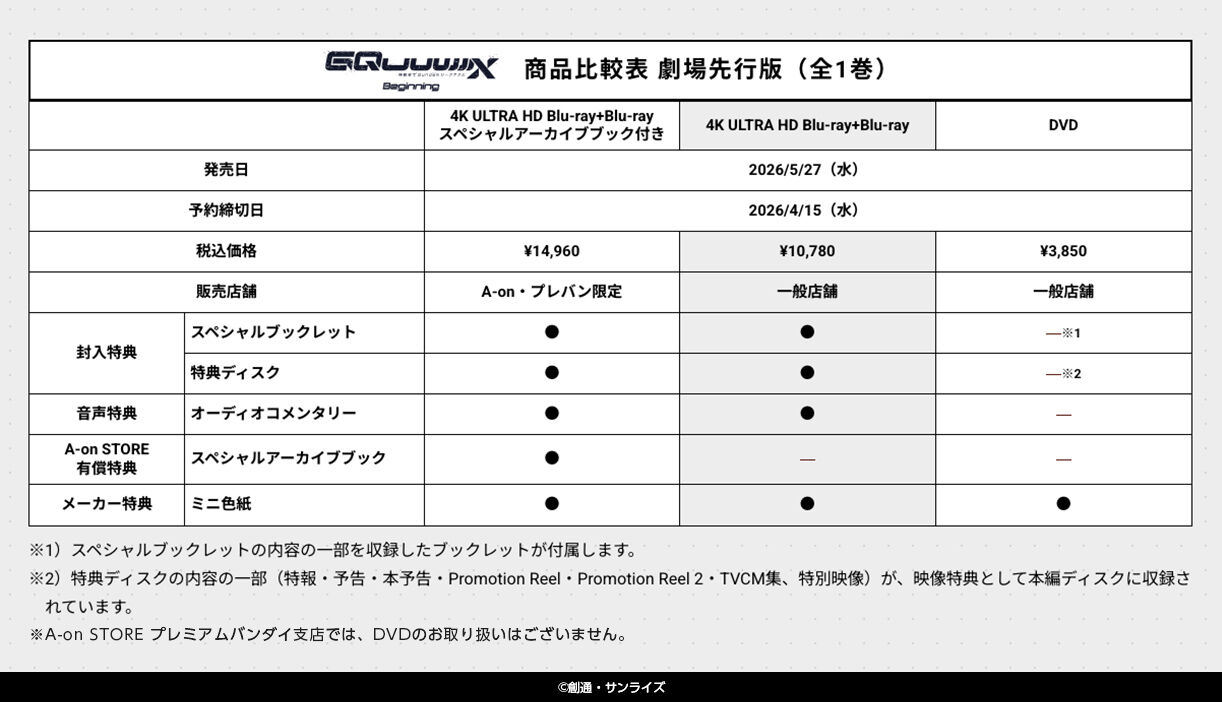 ※イベント会場、海外等で販売する場合がございます。 ※機動戦士Gundam GQuuuuuuX -Beginning- (4K ULTRA HD Blu-ray+Blu-ray)は、他店舗でもお取り扱いがございます。