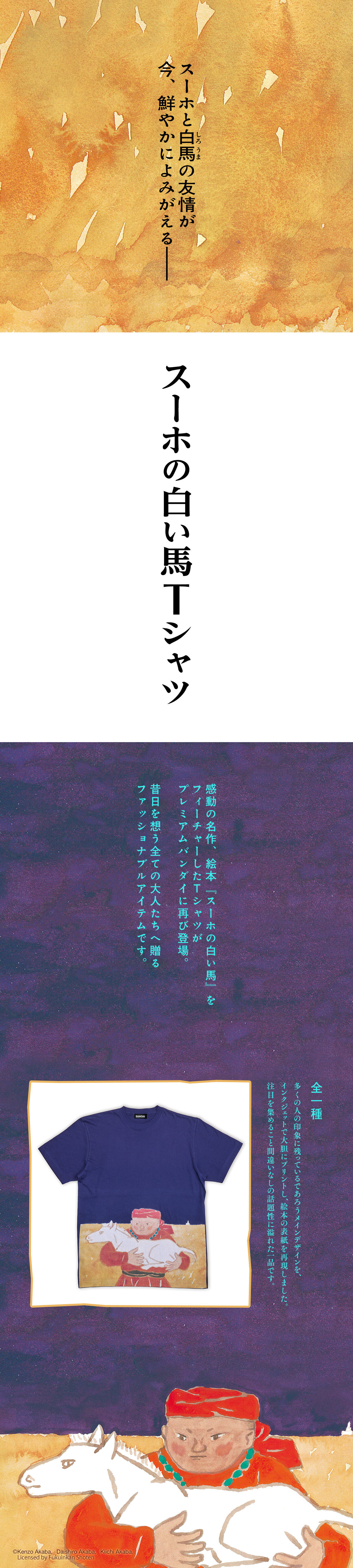 感動の名作、絵本『スーホの白い馬』をフィーチャーしたTシャツが登場。 昔日を想う全ての大人たちへ贈るファッショナブルアイテムです。