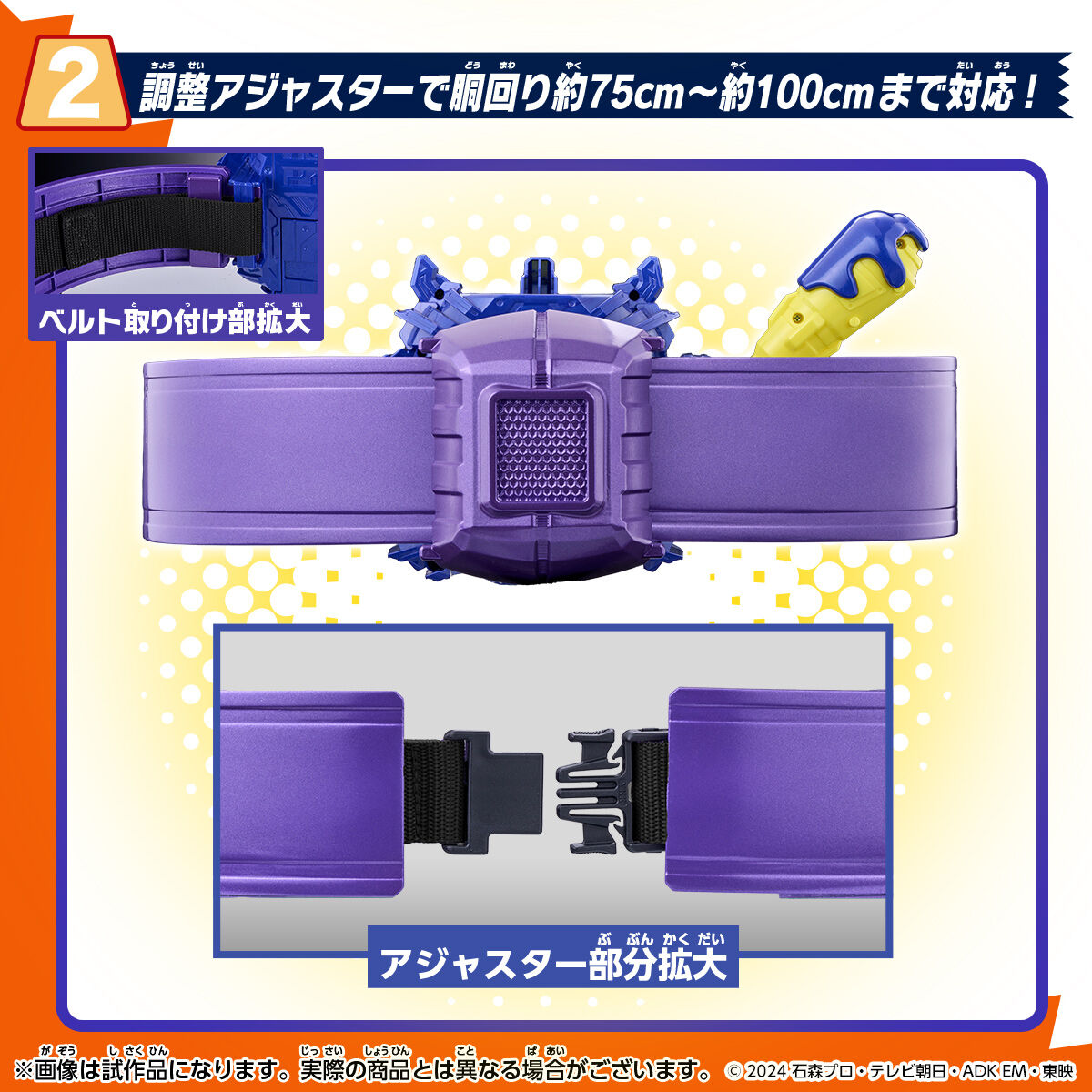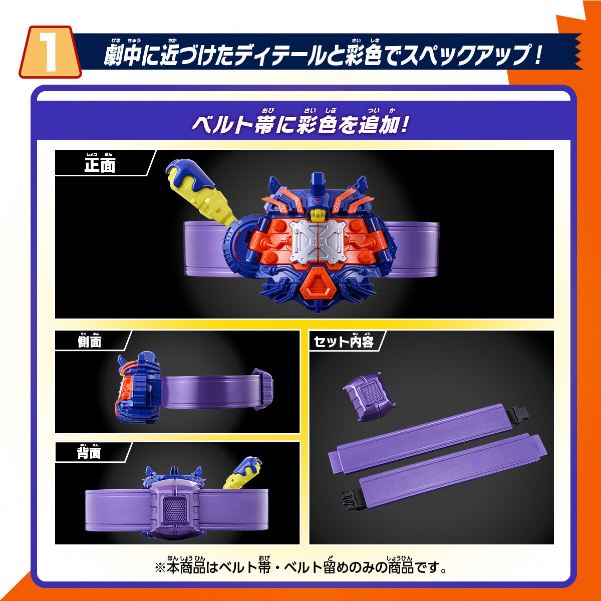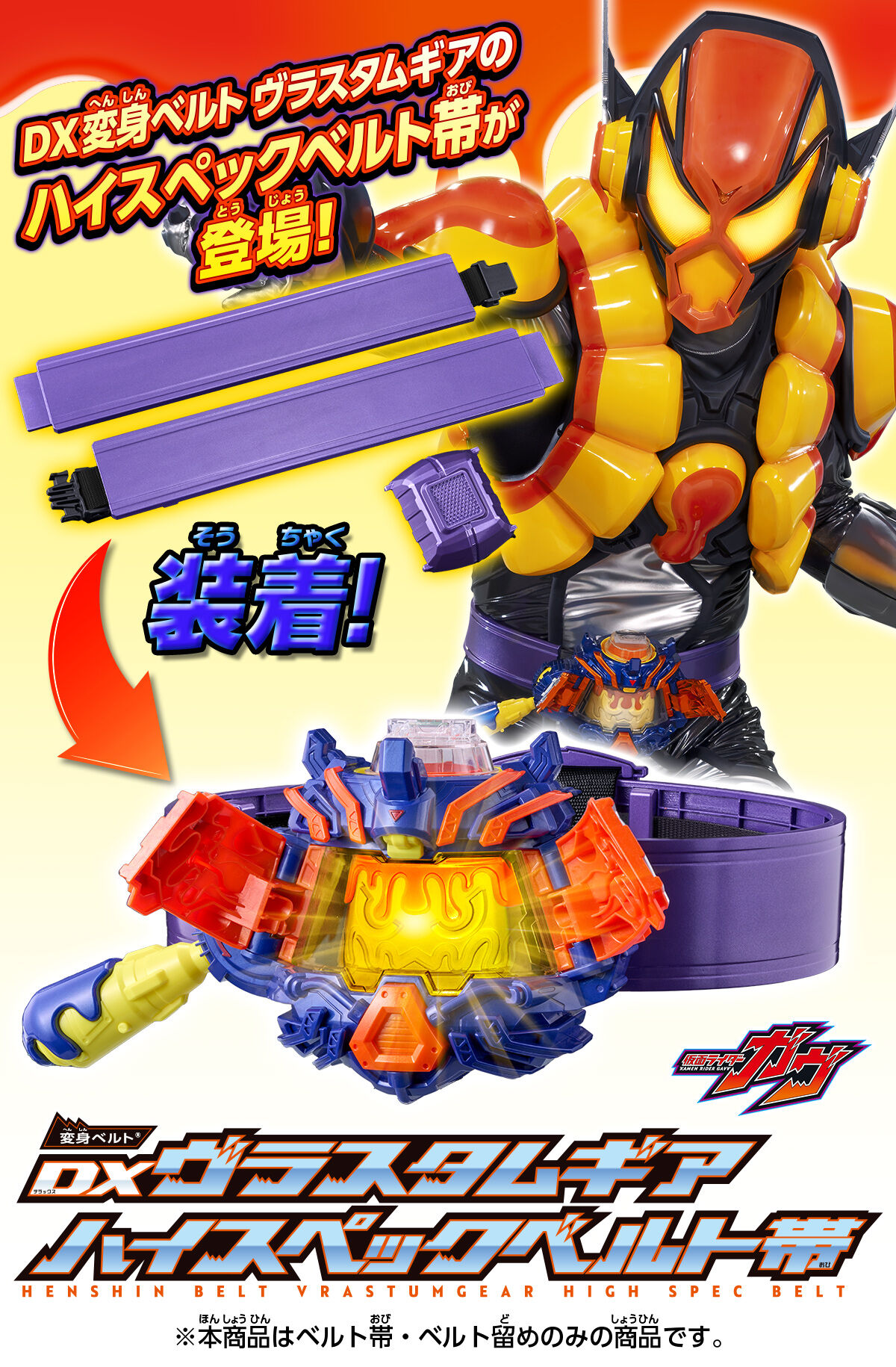 『仮面ライダーガヴ』より、変身ベルトヴラスタムギアの 大人向けハイスペックベルト帯が登場! ■商品説明 ベルト帯に彩色を追加し、劇中をイメージしたハイクオリティなディテールを実現いたしました。 ベルト帯は調整アジャスターで胴回り約75〜100センチまで対応可能で、幅広い年齢層のファンにお楽しみいただけます。 ■セット内容 変身ベルトヴラスタムギア ハイスペックベルト帯…左右各1 ハイスペックベルト帯専用ベルト留め…1