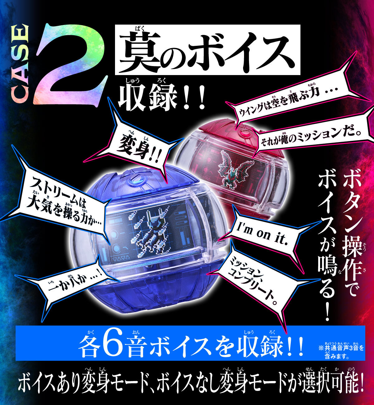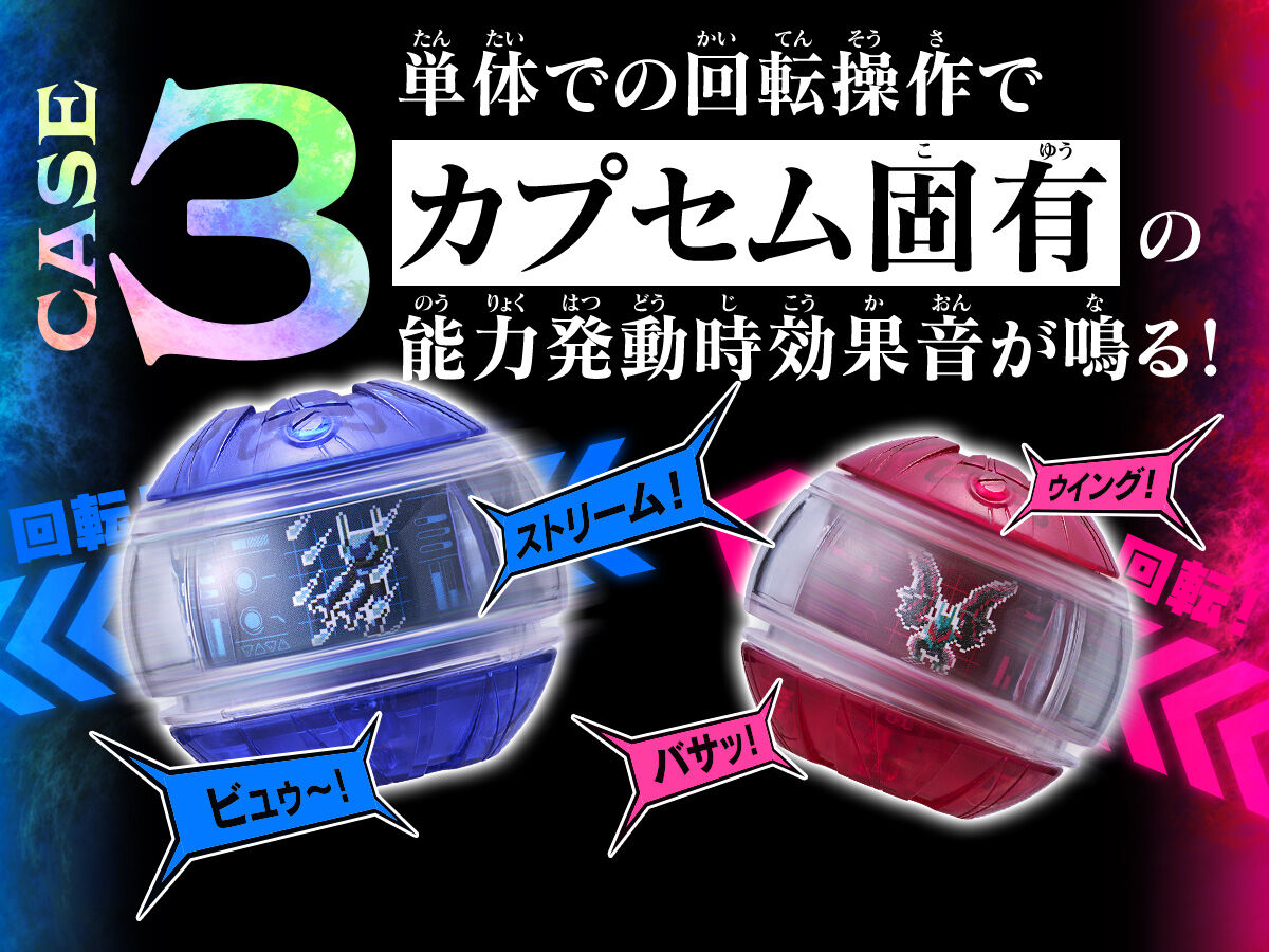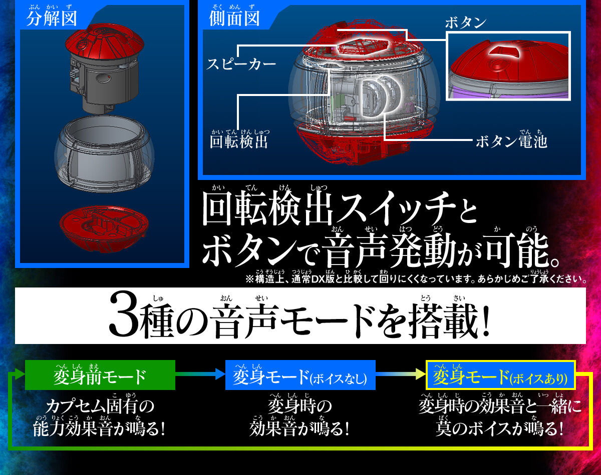 商品説明 『仮面ライダーゼッツ』に登場する、様々な能力を秘めたアイテム「カプセム」を、音声ユニットを搭載し様々なサウンドを発動可能とした「DXサウンドライダーカプセムシリーズ」として商品化いたします。 第ニ弾の本商品には、「ストリームカプセム」と「ウイングカプセム」をラインナップ。通常DX版と同じ本体サイズ内に電子部品を搭載しています。新たに搭載されたボタンを操作することはもちろん、カプセム特有の回転ギミックを検出するスイッチも搭載し、様々なアクションでカプセム本体から音声を発動することが可能となりました。音声モードは切り替えが可能で、カプセム固有の能力効果音が発動可能な「変身前モード」、変身時の効果音が発動可能な「変身モード(ボイスなし)」、変身時の効果音に合わせて万津莫(演:今井竜太郎)のボイスが鳴る「変身モード(ボイスあり)」の3種が搭載されています。 本商品は通常DX版同様に、別売りの「DXゼッツドライバー」と連動が可能。ドライバーにカプセムをセットして回転させることで、ドライバーから鳴る変身音に合わせてカプセムから追加効果音が発動します。さらに必殺技操作時も、必殺技後の追加効果音が発動します。 また本商品には主人公・万津莫のキャラクターボイスを収録。各カプセムに共通音声3音を含む6音ずつが収録されており、変身直前のボイスや劇中の印象的な台詞と共になりきり遊びが楽しめます。さらに「変身前モード」でカプセムを回転させることで、固有能力発動時の効果音が発動します。加えて、ストリームカプセムにはBGMも収録。1話から使用されている「戦闘中BGM」、「必殺技BGM」の2曲が再生可能です。 セット内容 ストリームカプセム…1 ウイングカプセム…1 商品サイズ H約45mm× W約50mm× D約50mm(共通) 対象年齢 3才以上 電池 LR44×4 ※セットされている電池はテスト用です 備考 お買い求めの前に:必ずお読みください。