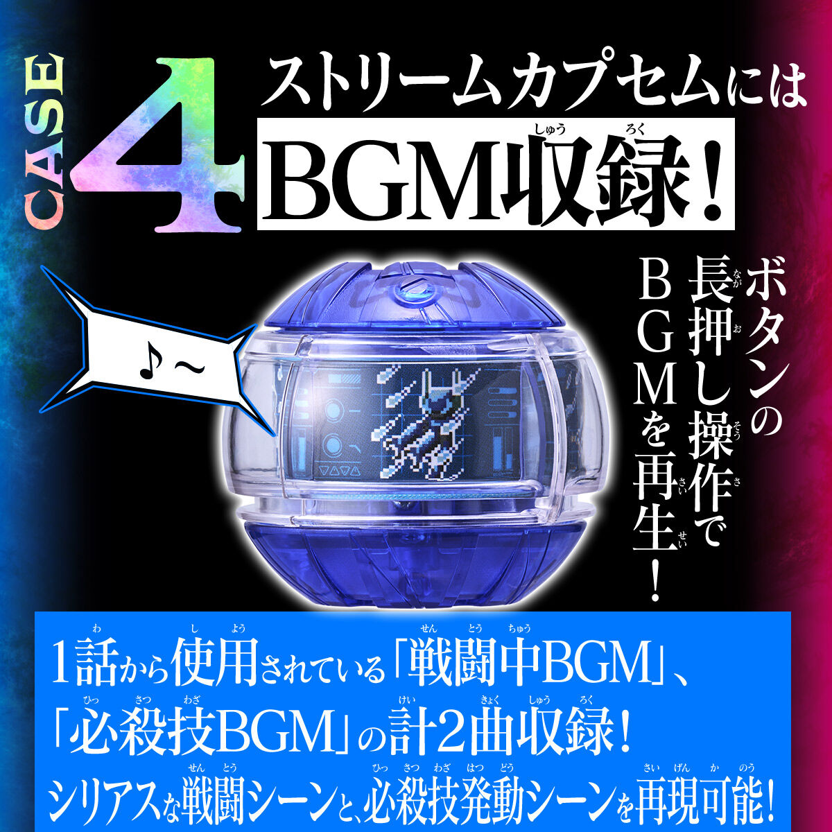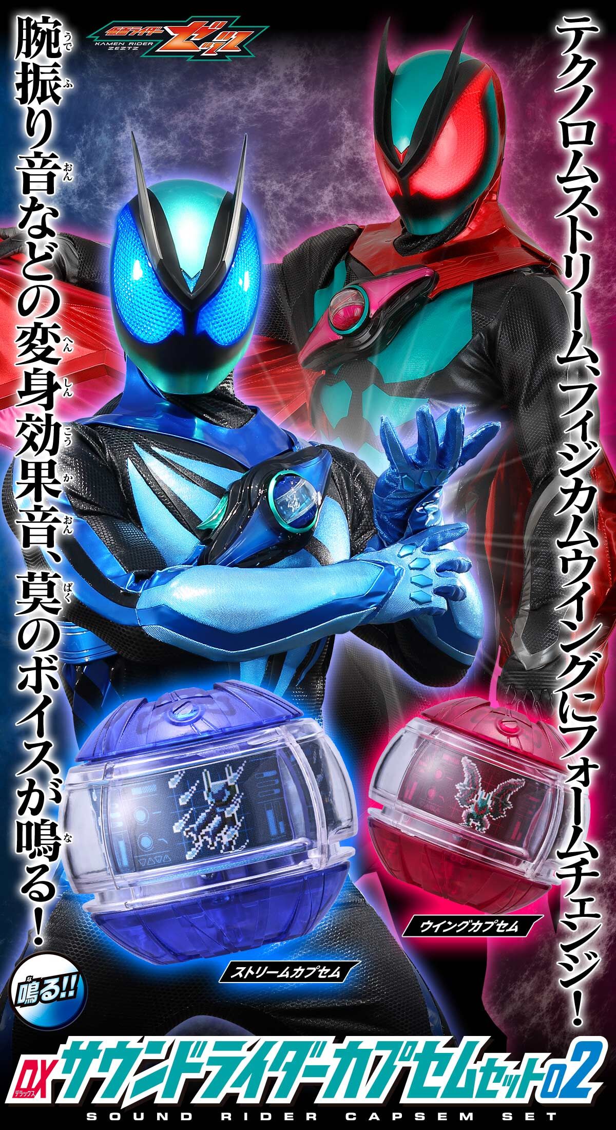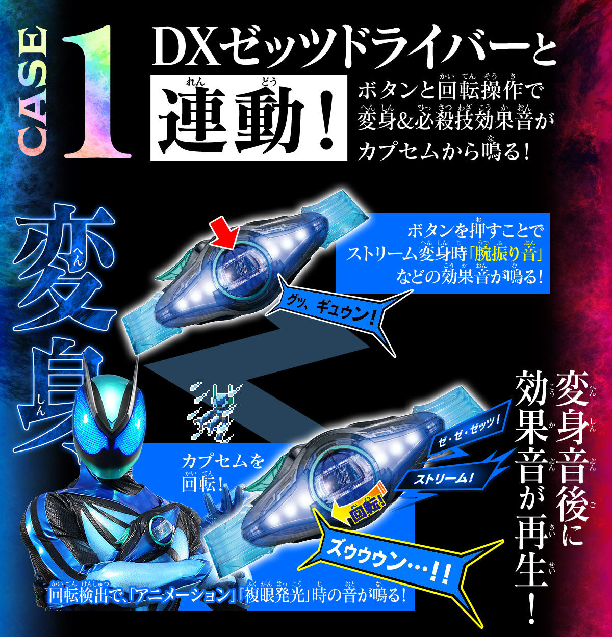 商品説明 『仮面ライダーゼッツ』に登場する、様々な能力を秘めたアイテム「カプセム」を、音声ユニットを搭載し様々なサウンドを発動可能とした「DXサウンドライダーカプセムシリーズ」として商品化いたします。 第ニ弾の本商品には、「ストリームカプセム」と「ウイングカプセム」をラインナップ。通常DX版と同じ本体サイズ内に電子部品を搭載しています。新たに搭載されたボタンを操作することはもちろん、カプセム特有の回転ギミックを検出するスイッチも搭載し、様々なアクションでカプセム本体から音声を発動することが可能となりました。音声モードは切り替えが可能で、カプセム固有の能力効果音が発動可能な「変身前モード」、変身時の効果音が発動可能な「変身モード(ボイスなし)」、変身時の効果音に合わせて万津莫(演:今井竜太郎)のボイスが鳴る「変身モード(ボイスあり)」の3種が搭載されています。 本商品は通常DX版同様に、別売りの「DXゼッツドライバー」と連動が可能。ドライバーにカプセムをセットして回転させることで、ドライバーから鳴る変身音に合わせてカプセムから追加効果音が発動します。さらに必殺技操作時も、必殺技後の追加効果音が発動します。 また本商品には主人公・万津莫のキャラクターボイスを収録。各カプセムに共通音声3音を含む6音ずつが収録されており、変身直前のボイスや劇中の印象的な台詞と共になりきり遊びが楽しめます。さらに「変身前モード」でカプセムを回転させることで、固有能力発動時の効果音が発動します。加えて、ストリームカプセムにはBGMも収録。1話から使用されている「戦闘中BGM」、「必殺技BGM」の2曲が再生可能です。 セット内容 ストリームカプセム…1 ウイングカプセム…1 商品サイズ H約45mm× W約50mm× D約50mm(共通) 対象年齢 3才以上 電池 LR44×4 ※セットされている電池はテスト用です 備考 お買い求めの前に:必ずお読みください。