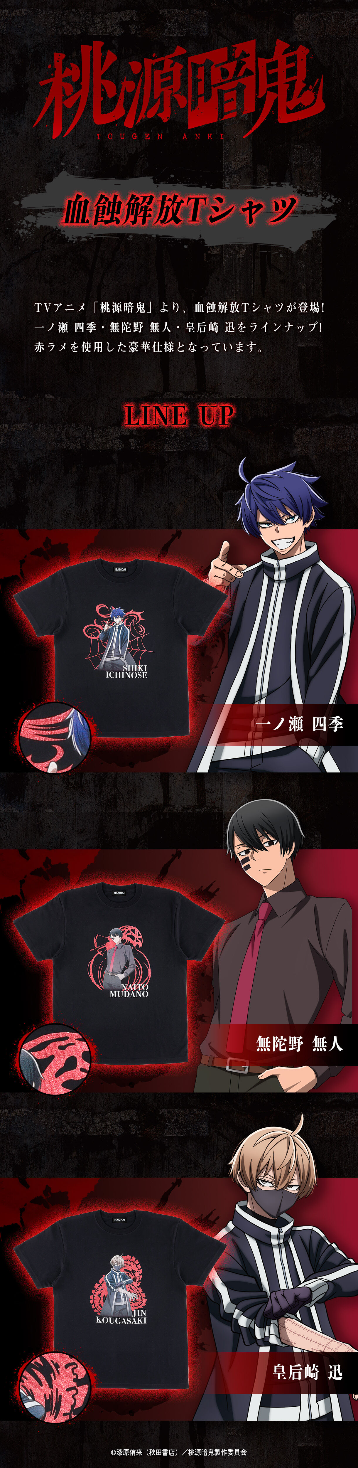 TVアニメ『桃源暗鬼』より、血蝕解放Tシャツが登場! 普段使いしやすい黒ボディに赤ラメを使用した豪華仕様となっています。 【商品情報】 ■サイズ: 【S:着丈65 身幅49 肩幅42 袖丈19cm】 【M:着丈69 身幅52 肩幅46 袖丈20cm】 【L:着丈73 身幅55 肩幅50 袖丈22cm】 【XL:着丈77 身幅58 肩幅54 袖丈24cm】 ■素材:綿100% ■生産エリア:中国 ■対象年齢:15歳以上