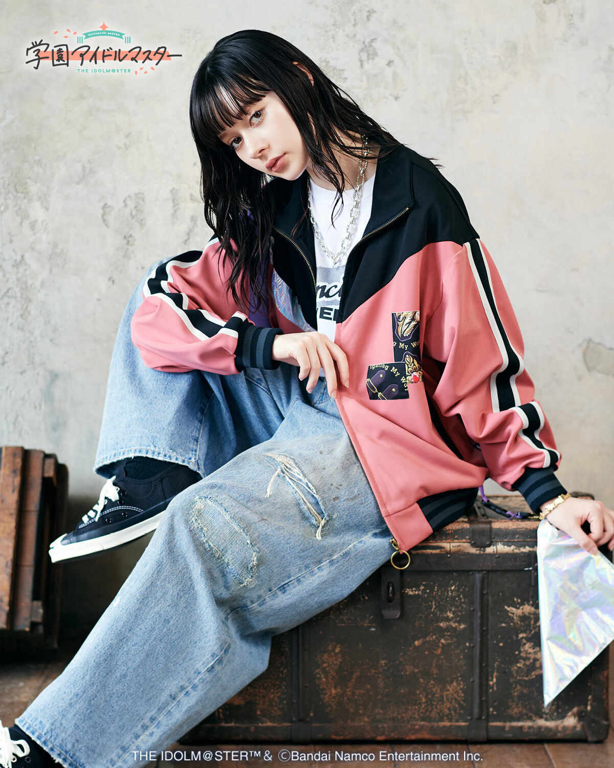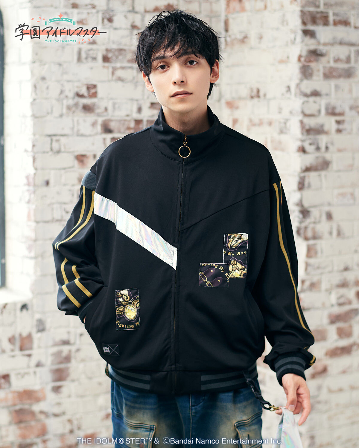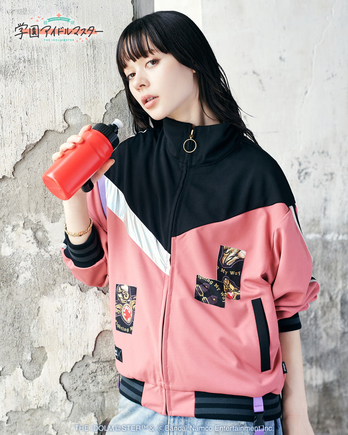 ■Fighting My Way Track Jacket(ピンク/ブラック 全2種) gladgarbと『学園アイドルマスター』がコラボレーション。 花海咲季の第一弾ソロ楽曲『Fighting My Way』の衣装コーディネートをスポーティなトラックジャケットに落とし込んだFighting My Way Track Jacket。 元アスリートというパーソナリティに迫る本作は本人の手首やスカートの腰に見られる2本ラインをリブで表現。 さらにはヴィンテージスカーフを思わせるパッチワークで衣装のワッペンを再現しています。 プリズム生地を用いたボディのラインはオリジナルに見られる稲妻状のシャイニーな意匠をトラックジャケットらしくアレンジしたもの。 特徴的な巻きスカートは取り外し可能バンダナキーホルダーへとアレンジ、細部までデザインをすくい上げてgladgarbらしい解釈を込めました。