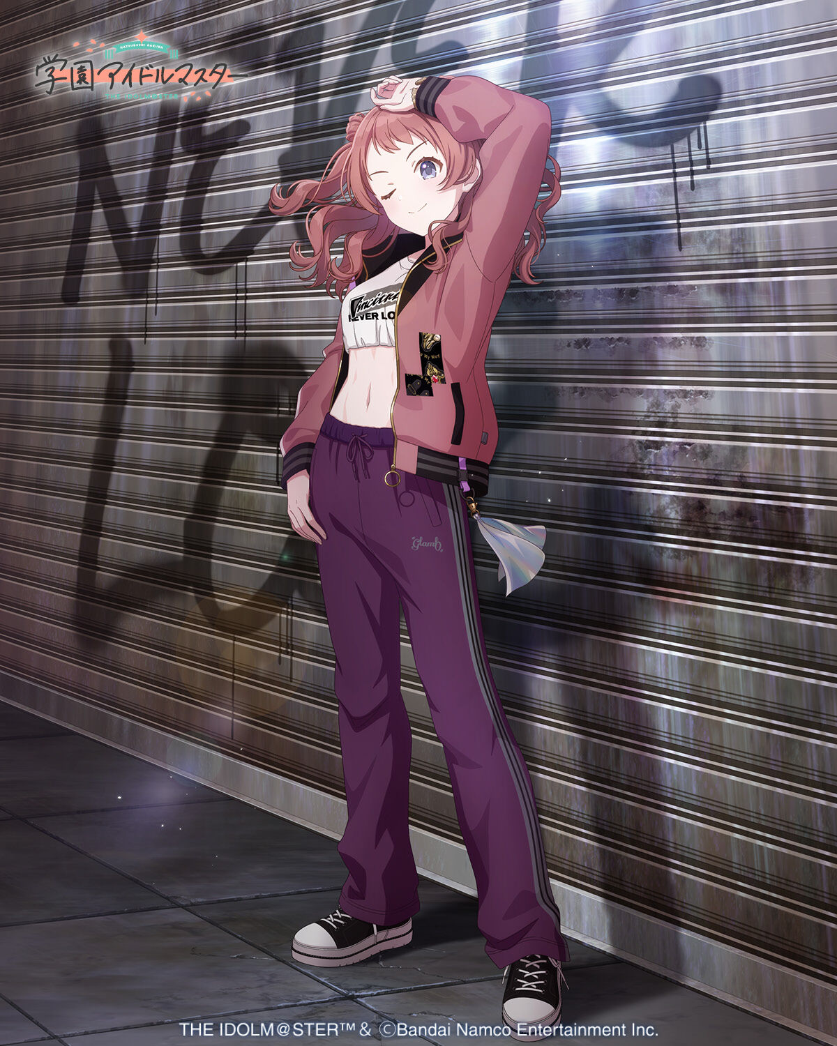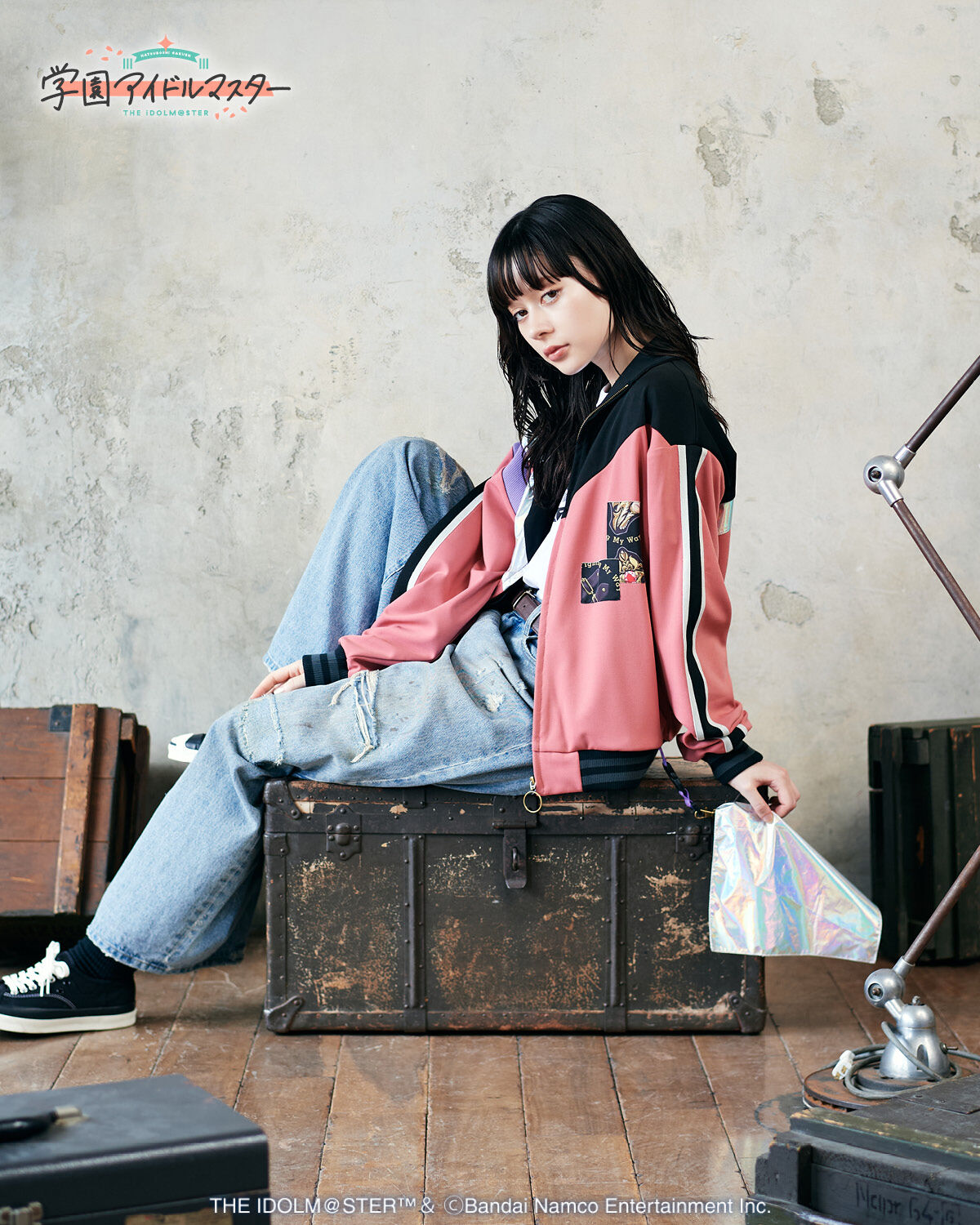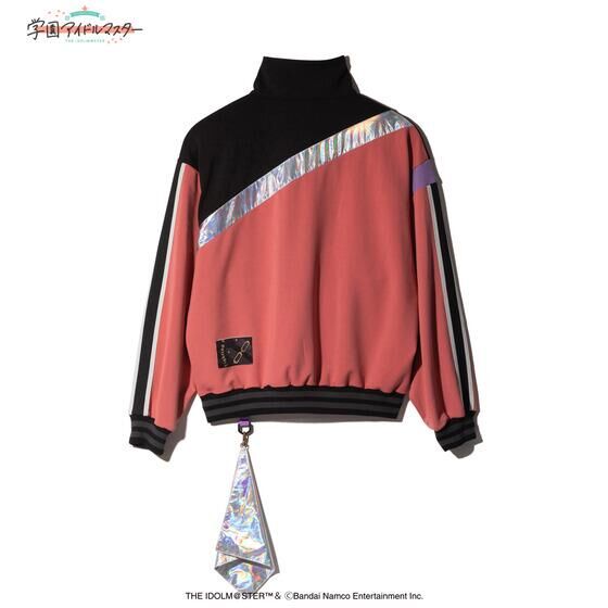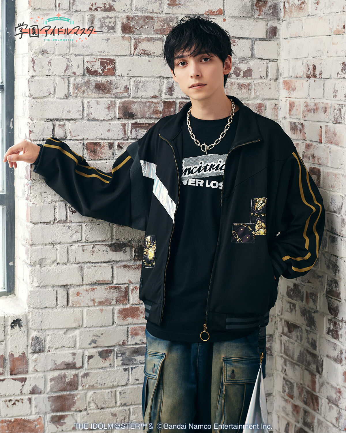 ■Fighting My Way Track Jacket(ピンク/ブラック 全2種) gladgarbと『学園アイドルマスター』がコラボレーション。 花海咲季の第一弾ソロ楽曲『Fighting My Way』の衣装コーディネートをスポーティなトラックジャケットに落とし込んだFighting My Way Track Jacket。 元アスリートというパーソナリティに迫る本作は本人の手首やスカートの腰に見られる2本ラインをリブで表現。 さらにはヴィンテージスカーフを思わせるパッチワークで衣装のワッペンを再現しています。 プリズム生地を用いたボディのラインはオリジナルに見られる稲妻状のシャイニーな意匠をトラックジャケットらしくアレンジしたもの。 特徴的な巻きスカートは取り外し可能バンダナキーホルダーへとアレンジ、細部までデザインをすくい上げてgladgarbらしい解釈を込めました。