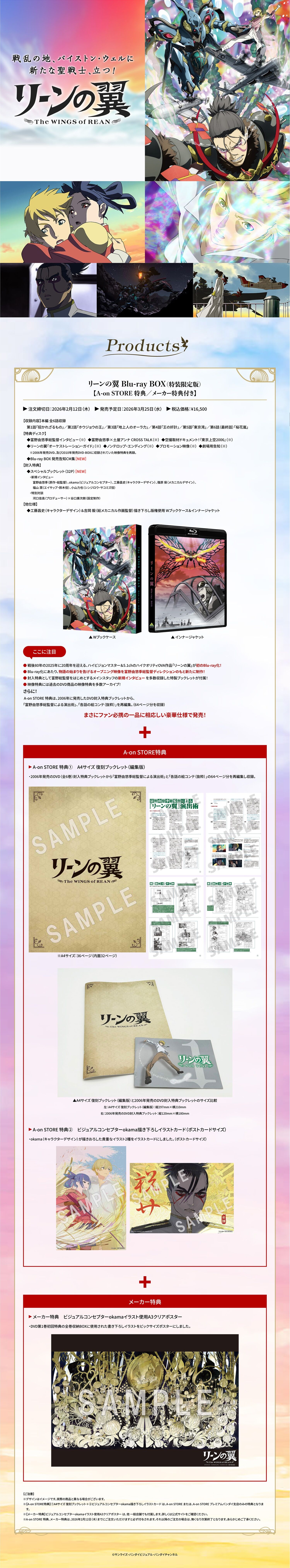 ![]() 「モビルスーツ」に続く究極のマシーン「オーラバトラー」が戦場を翔る! ガンダム・シリーズの富野由悠季総監督によるファンタジーロマンが初のBlu-ray化! 1BOXに全話収録し、スペシャルプライスでリリース!! 【全6話収録】 海と大地の狭間にある異世界バイストン・ウェルと地上世界を舞台に、世界をつなぐ力"リーンの翼"に招かれた少年エイサップ・鈴木と、ホウジョウ国王女リュクス・サコミズの恋と冒険の物語。 第1話「招かれざるもの」/第2話「ホウジョウの王」/第3話「地上人のオーラ力」/第4話「王の奸計」/第5話「東京湾」/第6話(最終話)「桜花嵐」 【封入特典】 ■スペシャルブックレット(32P) ・新規インタビュー 富野由悠季(原作・総監督)、okama(ビジュアルコンセプター)、工藤昌史(キャラクターデザイン)、篠原 保(メカニカルデザイン)、 福山 潤(エイサップ・鈴木役)、小山力也(シンジロウ・サコミズ役) ・特別対談 河口佳高(プロデューサー)×谷口廣次朗(設定制作) 【映像特典】 ■富野由悠季総監督インタビュー(※) ■富野由悠季×土屋アンナ CROSS TALK(※) ■空撮取材ドキュメント!『東京上空2006』(※) ■リーンの翼『オーケストレーション・ガイド』(※) ■ノンテロップ・エンディング(※) ■プロモーション映像(※) ■劇場用告知(※) ※ 2006年発売のDVD、及び2010年発売のDVD-BOXに収録されていた過去の映像特典を再録! ■Blu-ray BOX 発売告知CM集(※新規収録) 【他仕様】 ■工藤昌史(キャラクターデザイン)&吉岡 毅(総メカニカル作画監督)描き下ろし版権使用 Wブックケース&インナージャケット 【A-on STORE特典】 ■A4サイズ 復刻ブックレット(編集版) ※2006年発売のDVD(全6巻)封入特典ブックレットから「富野由悠季総監督による演出術」と「各話の絵コンテ(抜粋)」の64ページ分を再編集し収録。 ■ビジュアルコンセプターokama描き下ろしイラストカード(ポストカードサイズ)2種 ※okama(キャラクターデザイン)が描きおろした貴重なイラスト2種をイラストカードにしました。(ポストカードサイズ)
