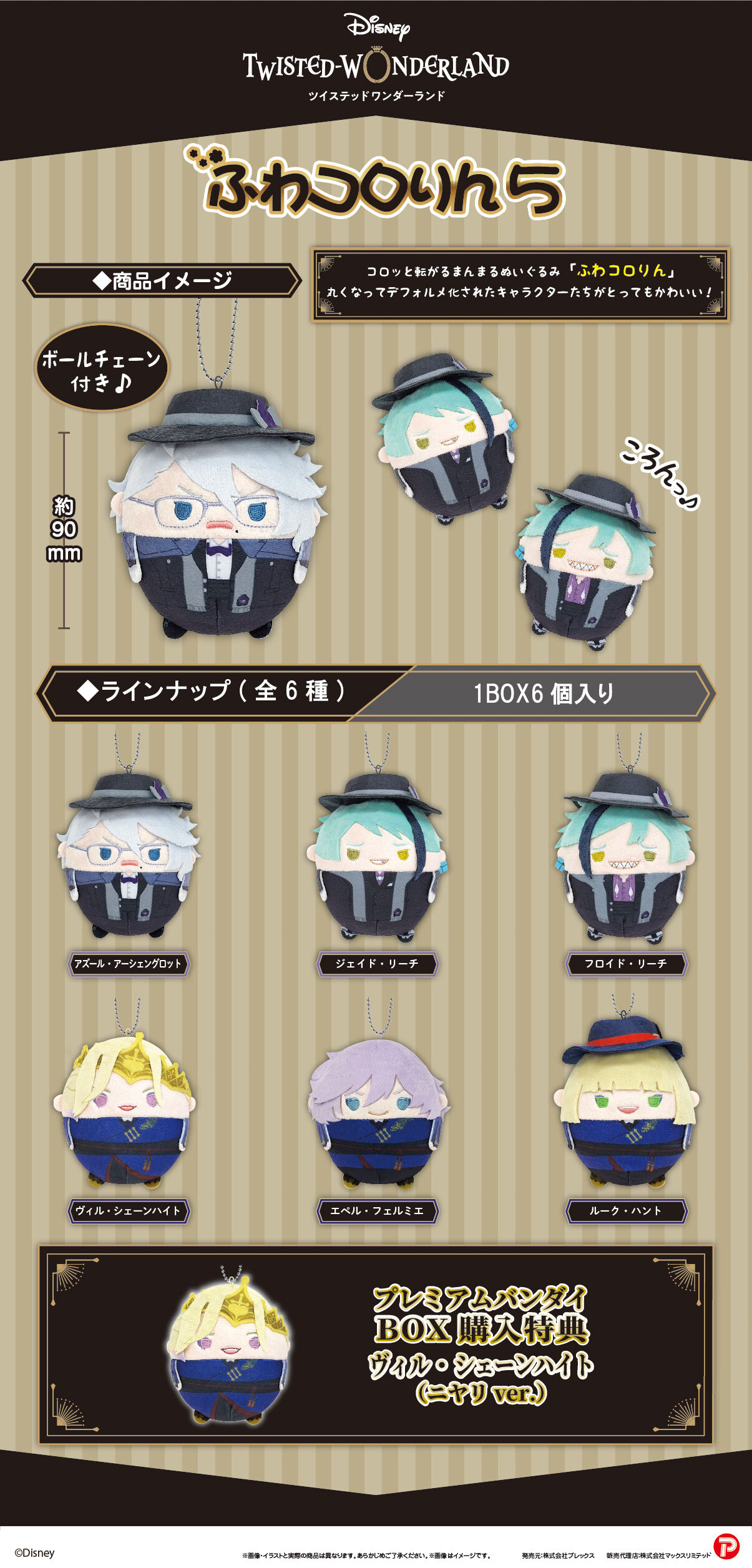 『ツイステッドワンダーランド』より、まんまるでふわふわコロっと転がる様な全長約90mmのデフォルメぬいぐるみマスコット、 丸くデフォルメされたキャラクターたちがとってもかわいい「ふわコロりん」第5弾が登場! プレミアムバンダイでBOX購入していただくと、購入特典として【ヴィル・シェーンハイト(ニヤリver.)】が付属します! ※本商品は監修中の為、実際の商品と画像とは多少異なりますのでご了承ください。 【商品名】ツイステッドワンダーランド ふわコロりん5 <ラインナップ> アズール・アーシェングロット/ジェイド・リーチ/フロイド・リーチ/ヴィル・シェーンハイト/エペル・フェルミエ/ルーク・ハント ※1BOXで全種揃います。 <プレミアムバンダイ BOX購入特典> ヴィル・シェーンハイト(ニヤリver.) 【価格】7,260円(税込)※BOX単位での販売となります。 【種類数】全6種+特典1種 【本体サイズ】約W90×H90mm 【本体材質】ポリエステル 【対象年齢】15才以上 【生産エリア】中国 【商品の取り扱い】全国ホビー店、アニメ雑貨専門店での取り扱いがございます。 ※店頭では単品販売(クローズドボックス)の予定です。 ※プレミアムバンダイ限定特典付きの本商品は26年4月発送予定となりますが、 一部店舗では、26年3月中に店頭に並ぶ場合がございます。 【発売元】株式会社プレックス ※画像と実際の商品は多少異なる場合がございます。 ※本商品は準備数に限りがございます。準備数に達した場合、早期にご注文の受付を終了させていただくことがございます。 ※注文期間は予告なく変更となる場合があります。 |
