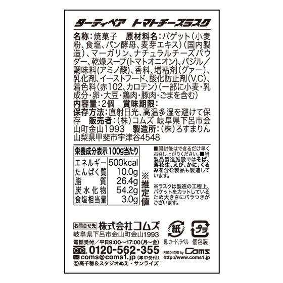 ※撮影環境やご利用のモニター環境により、実物と多少異なって見える場合がございます。 ※お客様都合により 商品を受け取らずに再配送となった場合、賞味期限切れにより再配送ができない場合がございます。 その場合は、本商品を含め、ご注文商品すべてをキャンセル・返金と致しますが、今後のお取引を停止する場合がございます。 パッケージカードも楽しめる、トマトチーズラスクとおまけに場面写ステッカーが入った商品です。 <商品仕様> 箱サイズ:縦70o×横105o×高さ30o 中身:トマトチーズラスク2個 おまけ:場面写ステッカー1枚入り(全6種) ※仕様等は予告なく変更する場合がございます。 ------------------------- 【賞味期限】2026年5月1日 ※生産の都合により2026年5月2日以降になることもございます ------------------------- 【原材料名】バゲット(小麦粉、食塩、パン酵母、麦芽エキス)(国内製造)、マーガリン、ナチュラルチーズパウダー、乾燥スープ(トマトオニオン)、バジル/調味料(アミノ酸)、香料、増粘剤(グァー)、乳化剤、イーストフード、酸化防止剤(V.C)、着色料(赤102、カロテン)(一部に小麦・乳成分・卵・大豆・鶏肉・豚肉・ごまを含む) ------------------------- 【ご注文受付数】 1注文につき 各10点まで 【商品の取り扱い】