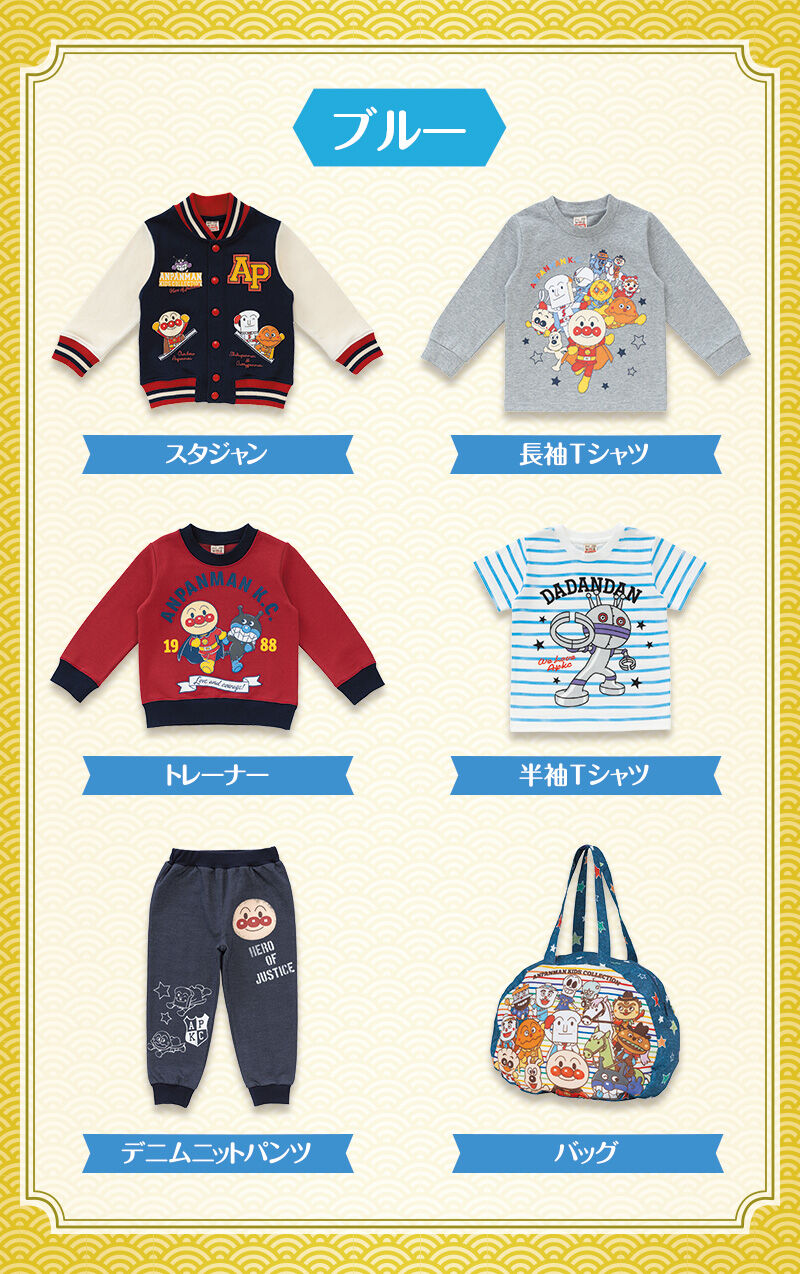 大好評のハッピーパックが今年も登場! ファスナー付きバッグに、スタジャン、トレーナー、長袖Tシャツ、半袖Tシャツ、デニムニットパンツが入った計6点のボリュームたっぷりの内容です♪ 【スタジャン】 ポケットからひょっこり顔を出すアンパンマンたちがポイントのスタジャン! 背中には大きなだだんだんがデザインされており、後ろ姿までかっこよく決まります。 お出かけコーデの主役になるおすすめの1枚です! <素材>本体:綿100% リブ部分:綿95%、ポリウレタン5% <サイズ>(約) 80cm :着丈36cm 身巾30cm 90cm :着丈38cm 身巾32cm 100cm:着丈41cm 身巾34cm 110cm:着丈44cm 身巾36cm 120cm:着丈47cm 身巾38cm 【トレーナー】 アンパンマンとばいきんまんが仲良くデザインされたトレーナー! シンプルながら元気いっぱいのカラーで、毎日のコーデにぴったり。 袖口と裾はリブ仕様で動きやすく、通園やおでかけにも大活躍の1枚です。 <素材>本体:綿100% リブ部分:綿95%、ポリウレタン5% <サイズ>(約) 80cm :着丈34cm 身巾29cm 90cm :着丈36cm 身巾31cm 100cm:着丈39cm 身巾33cm 110cm:着丈42cm 身巾35cm 120cm:着丈45cm 身巾37cm 【長袖Tシャツ】 アンパンマンとなかまたちのプリントが楽しい長袖Tシャツ! 風合いのある杢グレーの生地色でこなれ感があり、背面にもアンパンマンとロゴをあしらったデザインです。 <素材>本体:綿100% リブ部分:綿95%、ポリウレタン5% <サイズ>(約) 80cm :着丈36.5cm 身巾28cm 90cm :着丈38.5cm 身巾30cm 100cm:着丈41.5cm 身巾32cm 110cm:着丈44.5cm 身巾34cm 120cm:着丈47.5cm 身巾36cm 【半袖Tシャツ】 だだんだんの大きなプリントが目を引くボーダー柄の半袖Tシャツ! 爽やかな水色のボーダーで、夏まで活躍する一枚です。 <素材>本体:綿100% リブ部分:綿95%、ポリウレタン5% <サイズ>(約) 80cm :着丈36cm 身巾28cm 90cm :着丈38cm 身巾30cm 100cm:着丈41cm 身巾32cm 110cm:着丈44cm 身巾34cm 120cm:着丈47cm 身巾36cm 【デニムニットパンツ】 かすれ風プリントがおしゃれなデニムニットパンツ! 裾リブ仕様で少し大きめサイズでも引きずらず、動きやすさも抜群。 デイリーコーデに活躍する一本です。 <素材>本体:綿67%、ポリエステル30%、ポリウレタン3% リプ部分:綿95%、ポリウレタン5% <サイズ>(約) 80cm :股上17.5cm 股下26.5cm ウエスト42cm 90cm :股上18.5cm 股下31.5cm ウエスト44cm 100cm:股上19.5cm 股下36.5cm ウエスト46cm 110cm:股上20.5cm 股下42.5cm ウエスト48cm 120cm:股上21.5cm 股下48.5cm ウエスト50cm ※股上…ベルト含む ※ウエスト…ウエストゴム上がり×2 【バッグ】 カラフルで元気いっぱいのデザインがかわいいファスナー付きバッグです。 側面と持ち手はデニム風プリントでおしゃれ感もプラス。 お出かけやお泊まりにぴったりの、たっぷり入るサイズ感もうれしいポイント♪ <素材>本体:ポリエステル100% <サイズ>(約) 縦27cm × 横36cm x 奥行12.5cm ※高さは持ち手含まず 【ANPANMAN KIDS COLLECTION/ アンパンマンキッズコレクション】は 「着ているだけで笑顔になる」をコンセプトに、 ”アンパンマンといつでも一緒にいたい”という こども達の夢をかなえるコレクションです。 保育園や幼稚園で活躍するデイリー服から、 おでかけ着・ギフトにぴったりの雑貨まで、 幅広く取り扱っています。 2813351 |