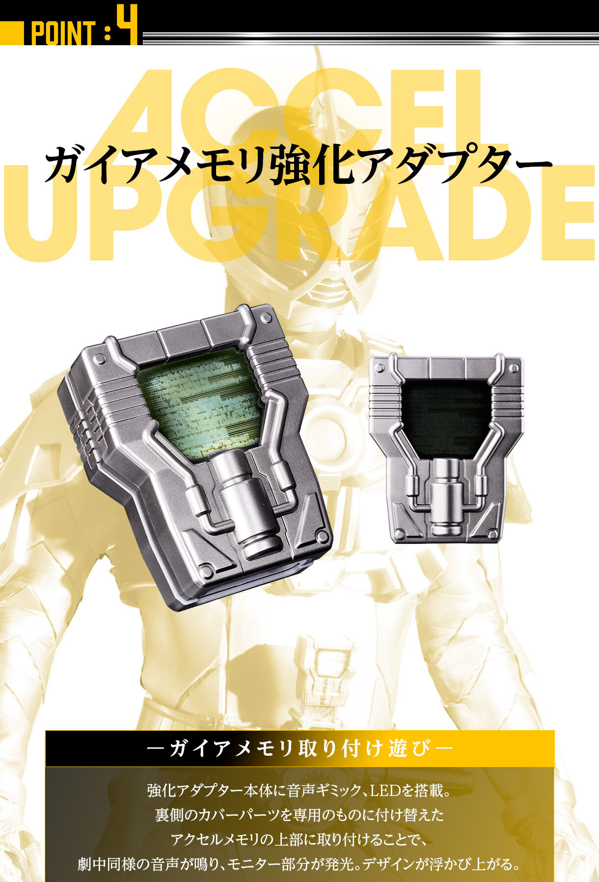 そして「仮面ライダーアクセルブースター」の変身アイテムであるガイアメモリ強化アダプターも初CSM商品化。本体に音声ギミック、LEDを搭載し、アクセルメモリをセットすることで、劇中の演出が再現可能です。本商品付属のアクセルメモリには「ブースターモード」を搭載。その状態でドライバーにセットすることで、アクセルブースターの変身音が発動、ドライバーの発光は黄色に変化し、効果音、台詞も専用のものに変化します。