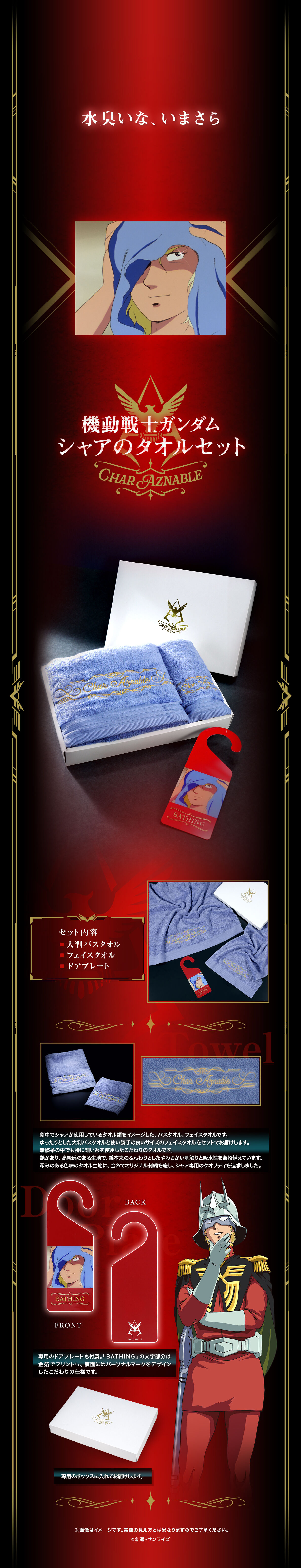劇中でシャアが使用しているタオル類をイメージした、バスタオル、フェイスタオルです。 無撚糸の中でも特に細い糸を使用した、綿本来のやわらかい肌触りが特徴のタオルです。 パイルに艶がある生地に、金糸でオリジナル刺繍を施しました。 色味にもこだわった大判バスタオルと、使い勝手の良いサイズのフェイスタオルです。