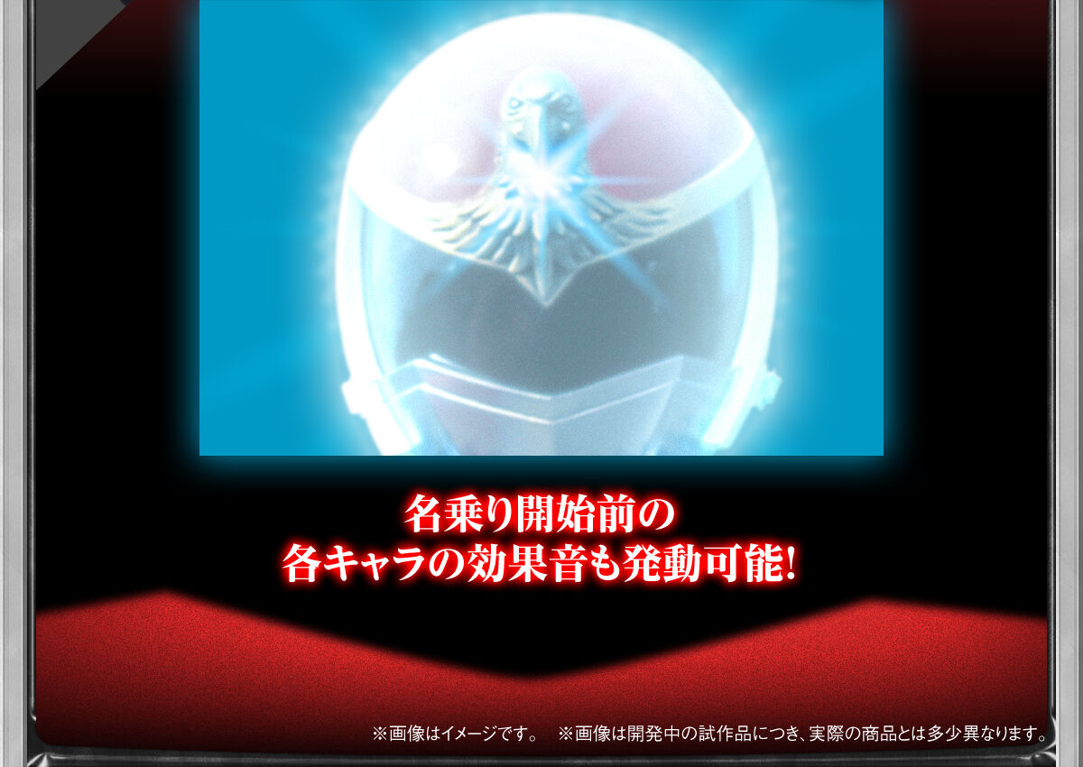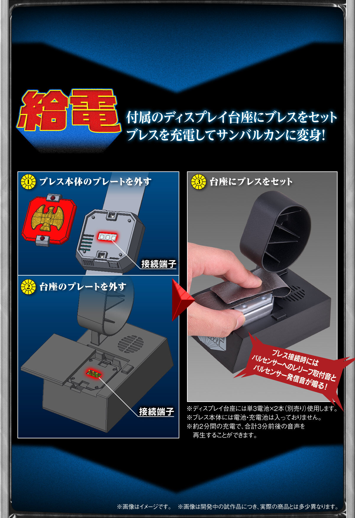 劇中のサイズ感を再現するため、バルカンブレス本体には電池を使用しない機構を実現。代わりに電池を搭載した専用台座からの給電ギミックを採用しており、ブレス本体への電池搭載無しで変身音声の発動やLEDの発光が可能となっています。ブレス本体にはモーションセンサーを搭載しており、劇中の変身アクションによって変身音が発動、劇中同様にブレス上下のLEDが発光します。またボタン押下により印象的な各種効果音が発動可能です。さらに名乗り開始前の各キャラクター効果音も収録しています。