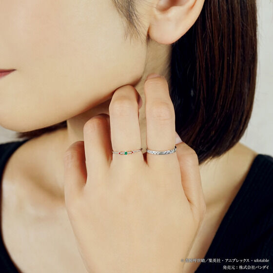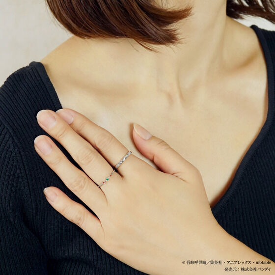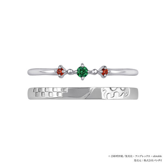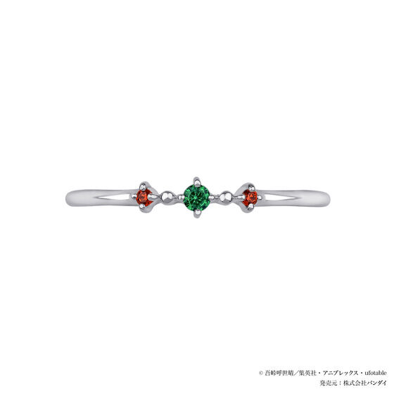 石付きのリングはセンターに炭治郎をイメージした緑のストーンをセッティングし、