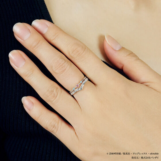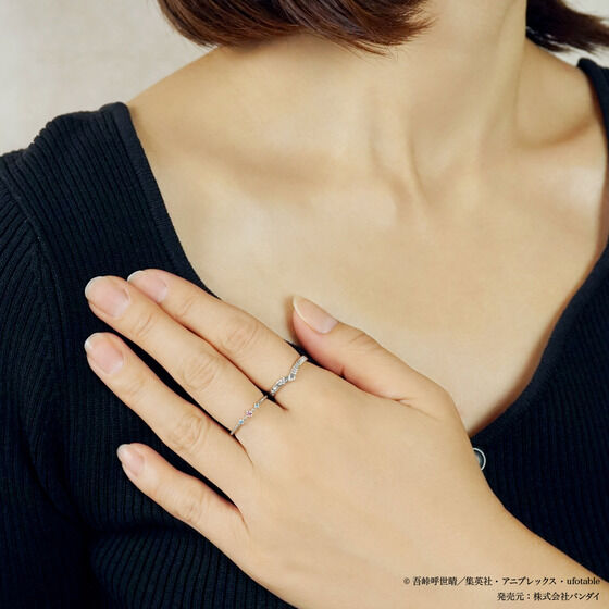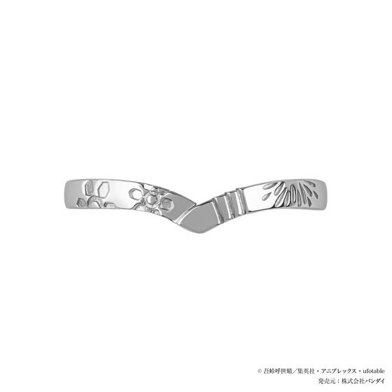 着物の衿をイメージしたV字のリングには恋雪の髪飾りと、狛治の腕、そして結婚を誓いあった場面の花火を刻印で表現。