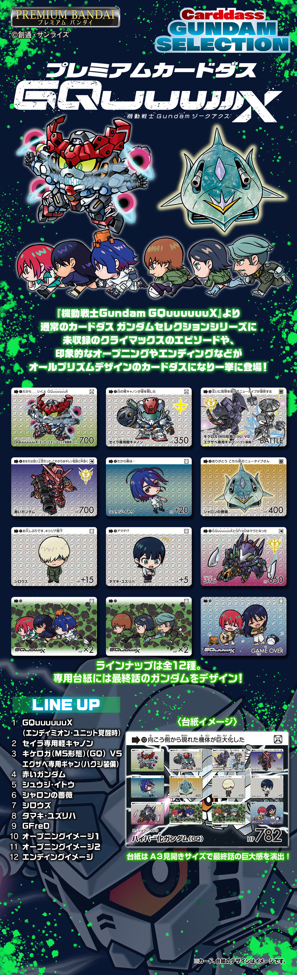 『機動戦士Gundam GQuuuuuuX』より、 プレミアムな台紙付きカード冊子がついに登場です!! 2025年に発売した「カードダス ガンダム セレクションシリーズ」に未収録の、 物語クライマックスのエピソードなどをはじめ、 オープニングやエンディングのワンシーンが待望のカードダス化! 全12種のカードはすべてキラキラのプリズムカード。 横井画伯のイラストを含む、すべて新規描き起こしのSDイラストを使用! さらに専用台紙には、な、なんと、 最終話に登場したガンダムがA3見開きサイズの超巨大カードダス風デザインで現れる…!? 【セット内容】 カード全12種(プリズム12種) 【対象年齢】 15歳以上 【サイズ】 カード:約59×86mm 台紙:約210×297mm 【備考】 ※商品仕様は予告なく変更になる場合があります。 ※掲載しているデザイン、商品画像は開発中のもののため、実際の商品とは異なる場合がございます。 ※商品仕様や発送日は予告なく変更になる場合がございます。予めご了承ください。 ※準備数に達し次第、ご注文の受付を終了致します。 多数のご要望をいただいた場合、準備数を調整して再度販売することがございます。予めご了承ください。 ※海外の一部地域で販売する場合がございます。 ※本商品収録のカードと過去のカードは同一のデザインではございません。 |