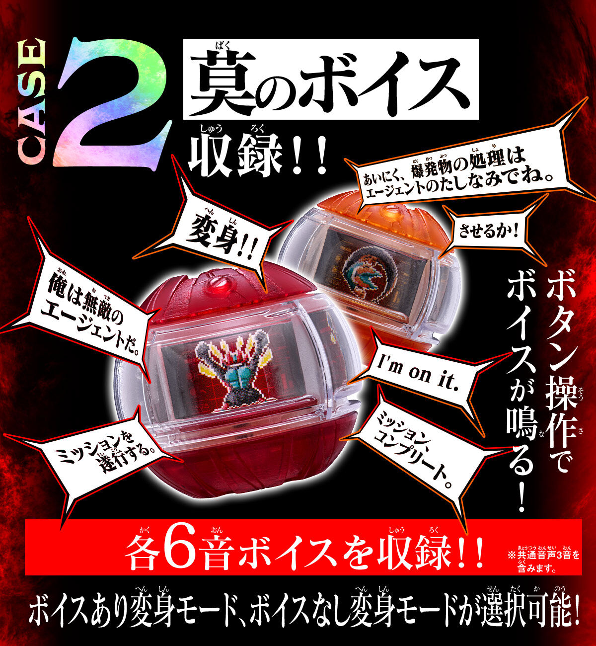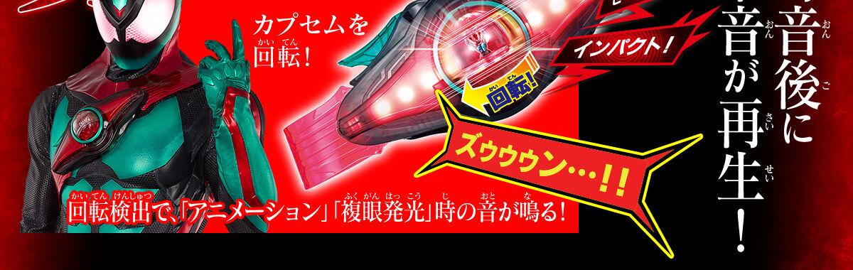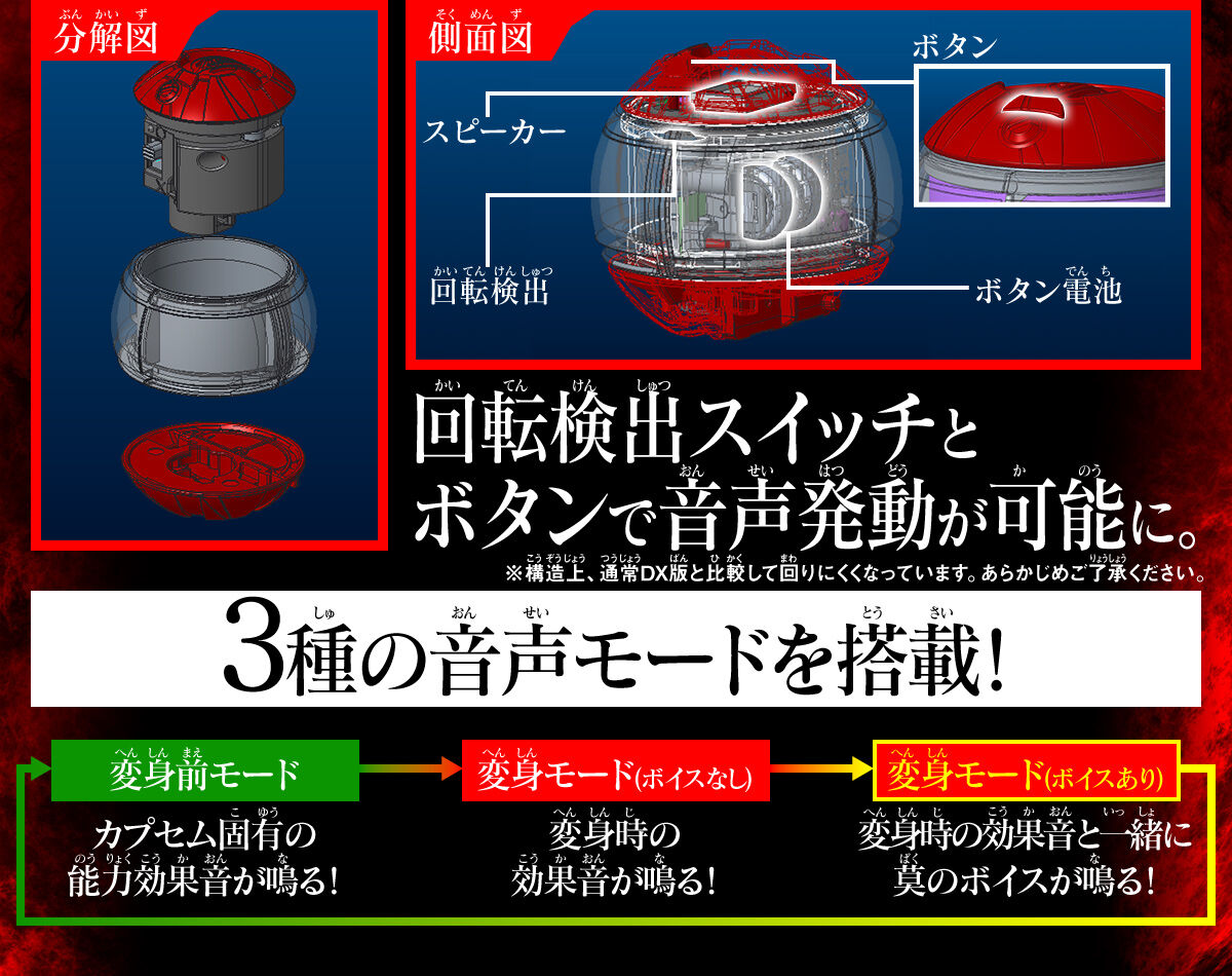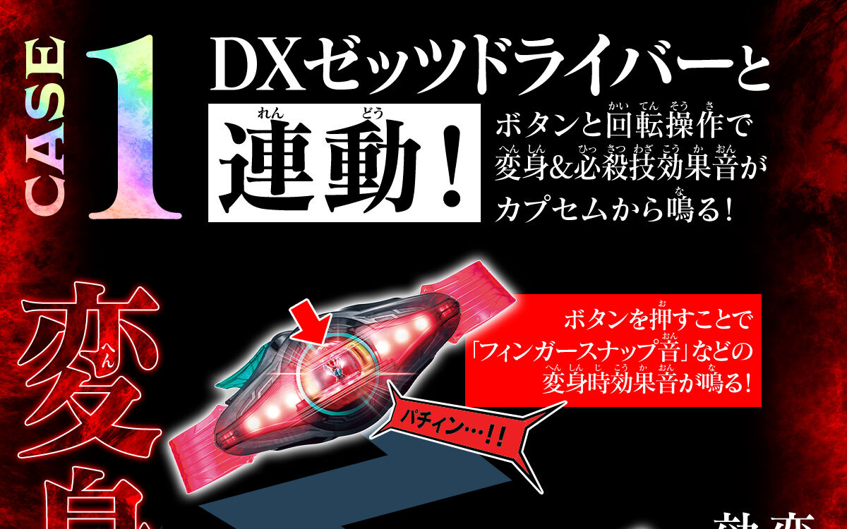 商品説明 『仮面ライダーゼッツ』に登場する、様々な能力を秘めたアイテム「カプセム」を、音声ユニットを搭載し様々なサウンドを発動可能とした「DXサウンドライダーカプセムシリーズ」として商品化いたします。 第一弾の本商品には、「インパクトカプセム」と「トランスフォームカプセム」をラインナップ。全パーツを完全新規造形にて構成し、通常DX版と同じ本体サイズ内に電子部品を搭載しています。新たに搭載されたボタンを操作することはもちろん、カプセム特有の回転ギミックを検出するスイッチも搭載し、様々なアクションでカプセム本体から音声を発動することが可能となりました。音声モードは切り替えが可能で、カプセム固有の能力効果音が発動可能な「変身前モード」、変身時の効果音が発動可能な「変身モード(ボイスなし)」、変身時の効果音に合わせて万津莫(演:今井竜太郎)のボイスが鳴る「変身モード(ボイスあり)」の3種が搭載されています。 本商品は通常DX版同様に、別売りの「DXゼッツドライバー」と連動が可能。ドライバーにカプセムをセットして回転させることで、ドライバーから鳴る変身音に合わせてカプセムから追加効果音が発動します。さらに必殺技操作時も、必殺技後の追加効果音が発動します。 また本商品には主人公・万津莫のキャラクターボイスを収録。各カプセムに共通音声3音を含む6音ずつが収録されており、変身直前のボイスや劇中の印象的な台詞と共になりきり遊びが楽しめます。さらに「変身前モード」でカプセムを回転させることで、固有能力発動時の効果音が発動します。加えて、インパクトカプセムにはBGMも収録。主題歌を含む印象的な2曲が再生可能です。