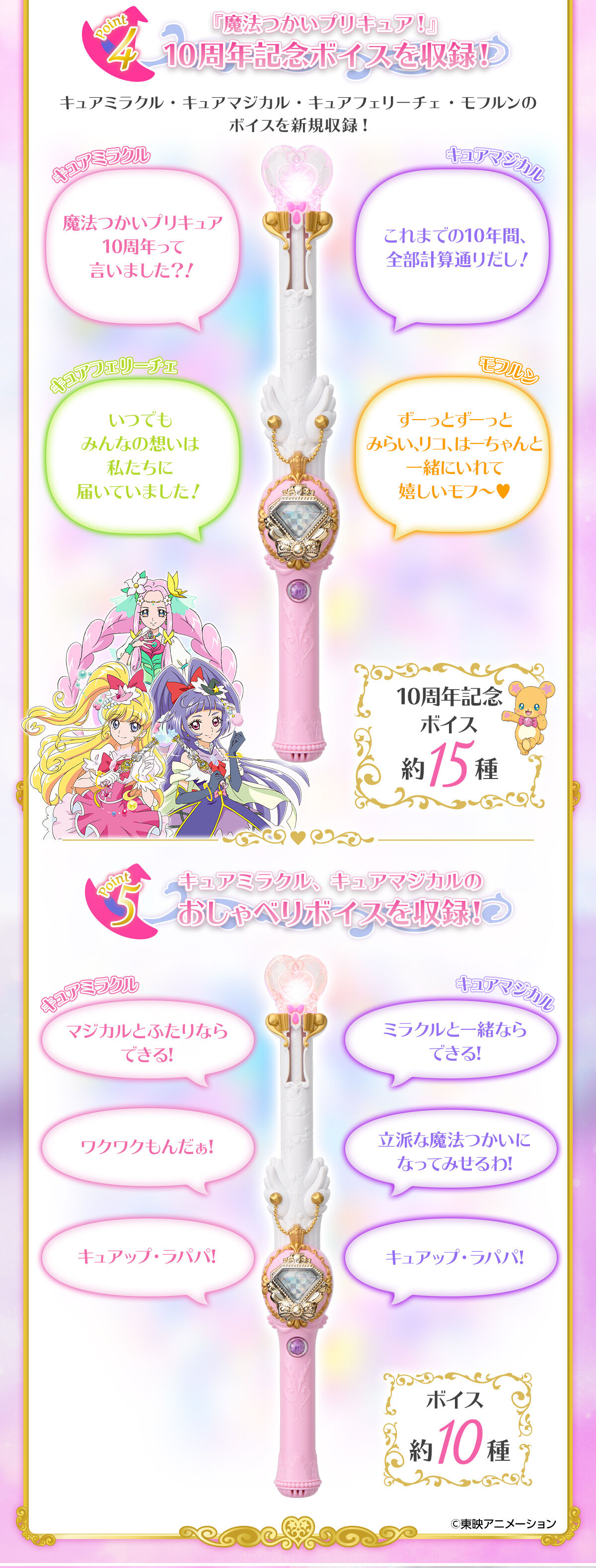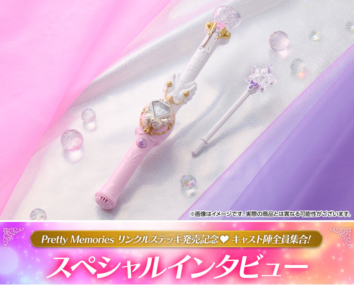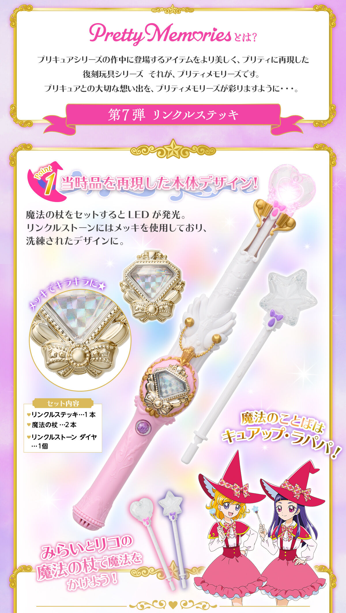 ■商品説明 プリキュアシリーズの作中に登場するアイテムを、より美しく、プリティに再現した復刻玩具のシリーズ「Pretty Memories」。 その第7弾として、2016年に放送された『魔法つかいプリキュア!』が放送10周年を迎えることを記念し、 作中の変身アイテム「リンクルステッキ」を大人向けのなりきり仕様で商品化します。 本商品は、劇中の金魔法(合体技)あそびを完全再現。作中のシーンを忠実に再現することが可能です。 外観は放送当時のデザインの再現にこだわりました。本体に魔法の杖をセットすると、先端のLEDが発光。 リンクルストーンにはキラキラのメッキ塗装を使用しており、洗練されたデザインを追求しました。 音声は、変身セリフや金魔法(合体技)セリフ、キャラクターのおしゃべり音声も多数収録しました。 キュアミラクル、キュアマジカルのリンクルステッキで必殺技「プリキュア・ダイアモンド・エターナル」を発動することができます。 また、ルビー、サファイア、トパーズのボイスも収録。 劇中のさまざまなシーンを再現することができます。 さらに、10周年を記念した特別なボイスを新規収録。キュアミラクル、キュアマジカル、キュアフェリーチェ、モフルンの、この商品だけのオリジナル音声を約15種類以上お楽しみいただけます。 本商品の発売を記念し、作品のキャストメンバーである高橋李依さん、堀江由衣さん、早見沙織さん、齋藤彩夏さんへのスペシャルインタビューを実施しました。 商品ページではインタビューコメントを掲載中です。 ■セット内容 リンクルステッキ本体…1 魔法の杖…2本 リンクルストーン ダイヤ…1 ■商品サイズ H約338mm×W約44.5mm×D約52mm ■対象年齢