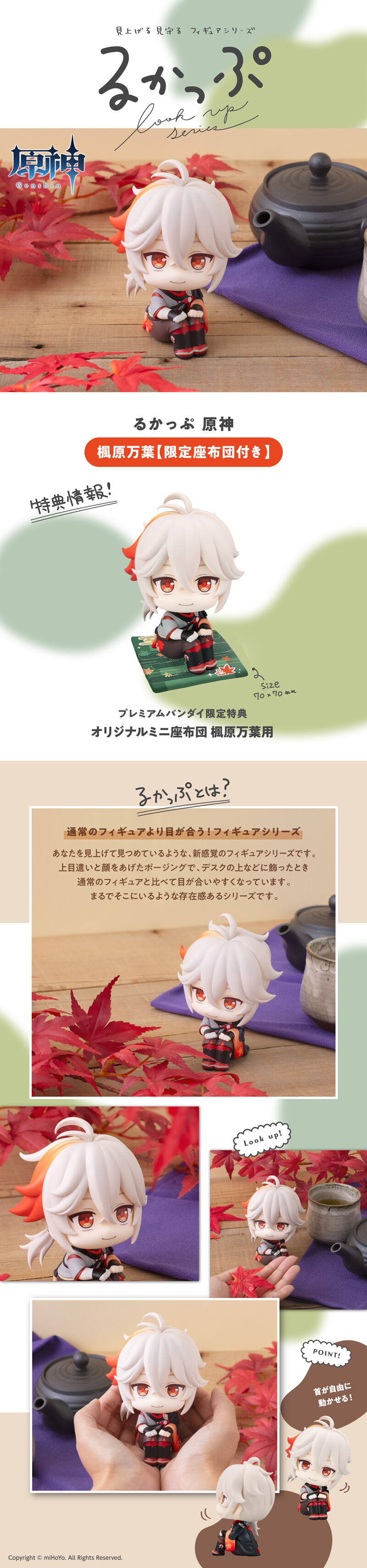 見上げる見守る「るかっぷ」シリーズに、 『原神』より「楓原万葉」が登場です! るかっぷは「look up」を元にした造語で、 見上げ&おすわりポーズが特長の人気フィギュアシリーズです。 デスクの上などに飾ったとき、通常のフィギュアと比べて目が合いやすくなっています。 ❝限定オリジナルミニ座布団❞が付属しているのは プレミアムバンダイ限定ですので、ご予約をお忘れなく! ------------------------------------------------------------------------------------------------ 原型/彩色:株式会社エムアイシー デフォルメデザイン協力:紙屋 【セット内容】 ・彩色済み完成品フィギュア…1 ・オリジナルミニ座布団…1 【商品素材】 本体:PVC 座布団:ポリエステル 【対象年齢】 15才以上 【商品サイズ】 全高約110mm 【ご注文受付数】 お一人様3個まで ※ご注文1回につき、1個購入可。3個購入時は3回分の手続きが必要。 【商品の取り扱い】 プレミアムバンダイ ※「オリジナルミニ座布団」付き商品はその他一般小売店での販売はございません。 【決済方法】 クレジットカード(出荷時決済)、Amazon Pay、 PayPay、プレバンPay、あと払い(ペイディ)のみのお取り扱いとなります。