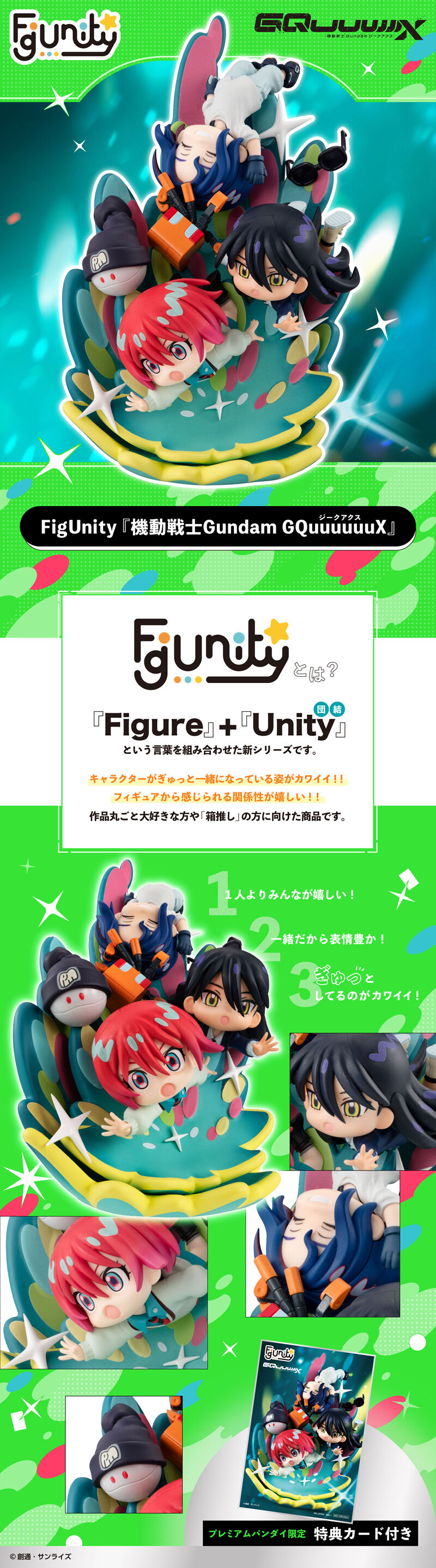 「FigUnity(フィギュニティ)」シリーズ第四弾は『機動戦士Gundam GQuuuuuuX(ジークアクス)』が登場! 「Figure」+「Unity(団結)」を組み合わせたコンセプトで、 みんな一緒が嬉しい!なディフォルメフィギュアです。 キラキラに飛び込んでいくシチュエーションをイメージして アマテ・ユズリハ(マチュ)、ニャアン、シュウジ・イトウの3人を立体化いたしました。 カラフルな台座からキャラクターが勢いよく今にも飛び出そうなシチュエーションを再現。 プレミアムバンダイ限定で撮り下ろしフォトカードが付属いたします。 原型/彩色:株式会社ピンポイント デフォルメデザイン協力:株式会社スタジオヴィガ 【セット内容】 ・彩色済み完成品フィギュア…1・限定フォトカード…1 【商品素材】 PVC、ABS 【対象年齢】 15才以上 【商品サイズ】 ・全高:約130mm ・全幅:約110mm ・奥行:約110mm 【ご注文受付数】 お一人様3個まで