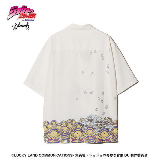 Harvest Shirt 「重ちー」のスタンド「ハーヴェスト」がアロハシャツに集うHarvest Shirt。 ボディの前後にホリゾンタルデザインであしらったのは小銭やデパート「亀友」のブルースタンプを集める「ハーヴェスト」達の姿。 サイケデリックなポップアートの画風が重ちーの快活な人物像を想起させるものとなっています。 胸ポケットにはトラブルの種となった宝くじを描いており、ポケットの中にまで柄の続きが現れる洋服ならではの遊び心ある一着です。 マットな質感のエステルボディはさらりと快適な肌触り。ビッグシルエットの輪郭はスタイルある佇まいを演出します。 【サイズ】単位:cm
