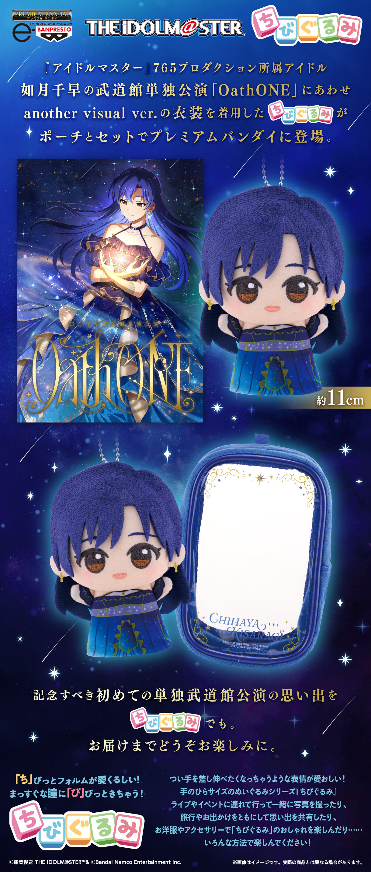 『アイドルマスター』765プロダクション所属アイドル・如月千早の武道館単独公演「OathONE」にあわせ、another visual ver.の衣装を着用した「ちびぐるみ」がおなまえ入りポーチとセットで登場!
