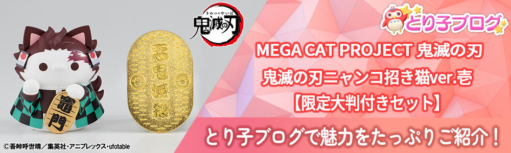 MEGACATシリーズについにTVアニメ「鬼滅の刃」が参戦です。 今回は招き猫ver.での登場。 ボリューム感あるデフォルメと造形でもっちり全8種のラインナップ。 第2弾も企画進行中です。 ※全8種がセットになった商品です。 @竈門炭治郎 A我妻善逸 B不死川玄弥 C村田 D冨岡義勇 E胡蝶しのぶ F煉獄杏寿郎 G悲鳴嶼行冥 プレミアムバンダイ、ジャンプキャラクターズストア、アニプレックスオンライン限定特典として 【大判メタルチャーム】が付属します。 ------------------------------------------------------------------------------------------------ 【セット内容】 ・彩色済み完成品フィギュア…8個 ・【限定特典】大判メタルチャーム…1個 【商品素材】 本体:PVC 、チャーム:メタル 【対象年齢】 15才以上 【商品サイズ】 各全高約55mm 【ご注文受付数】 お一人様3個まで ※ご注文1回につき、1個購入可。3個購入時は3回分の手続きが必要。 【商品の取り扱い】 プレミアムバンダイ、ジャンプキャラクターズストア、アニプレックスオンライン ※特典「大判メタルチャーム」付き商品はその他一般小売店での販売はございません。 【決済方法】 クレジットカード(出荷時決済)、Amazon Pay、 PayPay、プレバンPay、あと払い(ペイディ)のみのお取り扱いとなります。