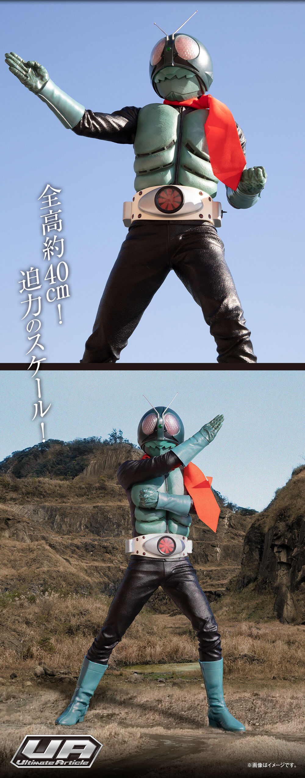 1971年春放送開始以来、長きに渡り愛され続ける永遠のヒーロー、「仮面ライダー」。 シリーズ原点の姿である「仮面ライダー旧1号」が圧倒的な存在感とギミックを備えたUAシリーズに再び登場! 本郷猛を演ずる藤岡弘、氏自らスーツアクターを務めた往時の勇姿を40pの迫力のスケールで再現! ビス等細部までこだわったマスク、初期鹿革スーツの質感をはじめ、タイフーンベルトのキャッチ式金具、 エナージコンバーターのプレート部やトグルスイッチ等細部ディテールに至るまで精密に再現。 また、臨場感を演出するライト&サウンドギミックを搭載! スイッチON1で、ベルトに風圧を受けて変身に至るオリジナル効果音と共に「Cアイ(両目)」「Oシグナル(額)」が点灯、 ON2への切り替えで戦闘シーン等でおなじみの曲「レッツゴー!!ライダーキック」(BGM・約150秒)を再生します。 ポージングは旧1号を象徴するライダーポーズの他、付属のオプションアームの交換で ライダーチョップを彷彿とさせる別パターンのアクションポーズを再現することが可能です。 迫力の造形、音と光による臨場感を是非お手元で楽しみください。 ------------------------------------------------------------------------------------------------