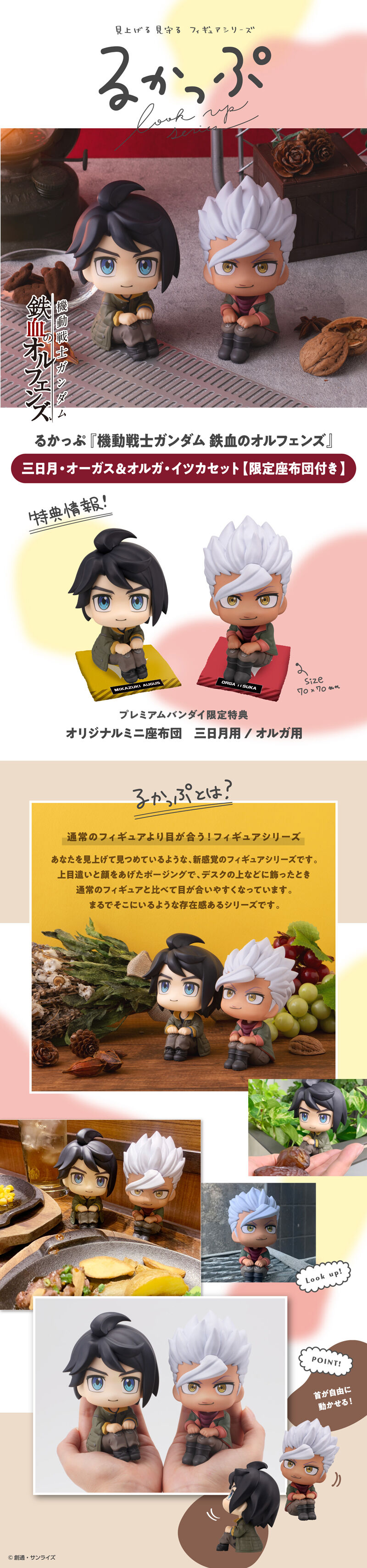 るかっぷ シリーズに、TVアニメ10周年を迎えた『機動戦士ガンダム 鉄血のオルフェンズ』の 「三日月・オーガス」と「オルガ・イツカ」が登場です。 るかっぷは「look up」を元にした造語で、見上げ&おすわりポーズが特長の人気フィギュアシリーズです。 デスクの上などに飾ったとき、通常のフィギュアと比べて目が合いやすくなっています。 首は可動で表情をつけて楽しむことができます。 ❝限定ミニ座布団❞が付属しているのはプレミアムバンダイ限定ですので、ご予約をお忘れなく! ------------------------------------------------------------------------------------------------ 原型/彩色:株式会社エムアイシー デフォルメデザイン協力:TAMPOPO 【セット内容】 ・彩色済み完成品フィギュア…2 ・オリジナルミニ座布団…2 【商品素材】 本体:PVC 座布団:ポリエステル 【対象年齢】 15才以上 【商品サイズ】 三日月・オーガス:全高約110mm オルガ・イツカ:全高約110mm 【ご注文受付数】 お一人様3個まで ※ご注文1回につき、1個購入可。3個購入時は3回分の手続きが必要。 【商品の取り扱い】 プレミアムバンダイ ※「オリジナルミニ座布団」付き商品はその他一般小売店での販売はございません。 【決済方法】 クレジットカード(出荷時決済)、Amazon Pay、 PayPay、プレバンPay、あと払い(ペイディ)のみのお取り扱いとなります。
