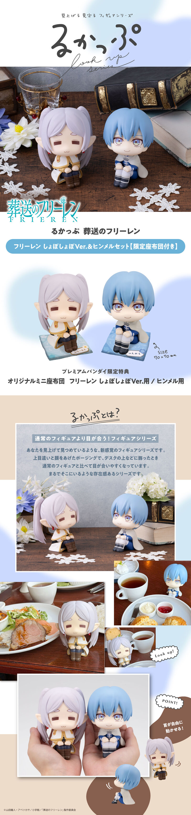 「るかっぷ」シリーズに、TVアニメ『葬送のフリーレン』より 「フリーレン しょぼしょぼVer.」と「ヒンメル」が登場します! るかっぷは「look up」を元にした造語で、見上げ&おすわりポーズが特長の人気フィギュアシリーズです。 デスクの上などに飾ったとき、通常のフィギュアと比べて目が合いやすくなっています。 ❝限定ミニ座布団❞が付属しているのはプレミアムバンダイ限定ですので、ご予約をお忘れなく! ------------------------------------------------------------------------------------------------ 原型/彩色:株式会社エムアイシー デフォルメデザイン協力:株式会社スタジオヴィガ 【セット内容】 ・彩色済み完成品フィギュア…2 ・オリジナルミニ座布団…2 【商品素材】 本体:PVC 座布団:ポリエステル 【対象年齢】 15才以上 【商品サイズ】 フリーレン:全高約110mm ヒンメル:全高約110mm 【ご注文受付数】 お一人様3個まで ※ご注文1回につき、1個購入可。3個購入時は3回分の手続きが必要。 【商品の取り扱い】 プレミアムバンダイ ※「オリジナルミニ座布団」付き商品はその他一般小売店での販売はございません。 【決済方法】 クレジットカード(出荷時決済)、Amazon Pay、 PayPay、プレバンPay、あと払い(ペイディ)のみのお取り扱いとなります。