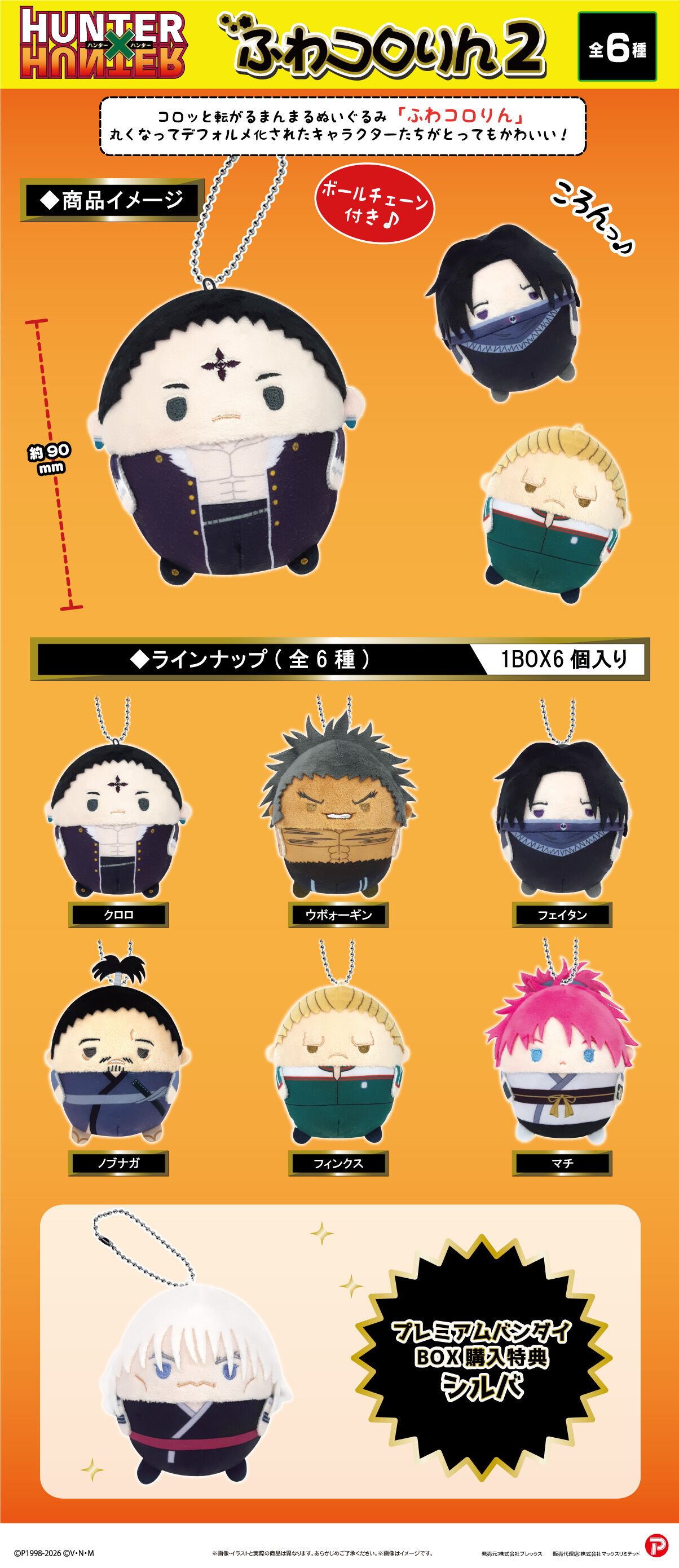 コロッと転がる、まんまるでふわふわコロっとした全長約9cmのデフォルメぬいぐるみマスコット! 【商品名】HUNTER×HUNTER ふわコロりん2 【商品の取り扱い】全国ホビー店、アニメ雑貨専門店での取り扱いがございます。 ※店頭では単品販売(クローズドボックス)の予定です。 ※プレミアムバンダイ限定特典付きの本商品は26年6月発送予定となりますが、 一部店舗では、26年5月中に店頭に並ぶ場合がございます。 【ご注文受付数】1注文につき6セットまで 【発売元】株式会社プレックス ※本商品は2024年3月発売商品の再販商品となります。 ※原材料や工賃の値上げの状況で、誠に不本意ではございますが、品質の維持・向上のため、商品価格を改定させていただくことになりました。 ※写真と実際の商品は多少異なる場合がございます。 ※本商品は準備数に限りがございます。準備数に達した場合、早期にご注文の受付を終了させていただくことがございます。 ※注文期間は予告なく変更となる場合があります。 |