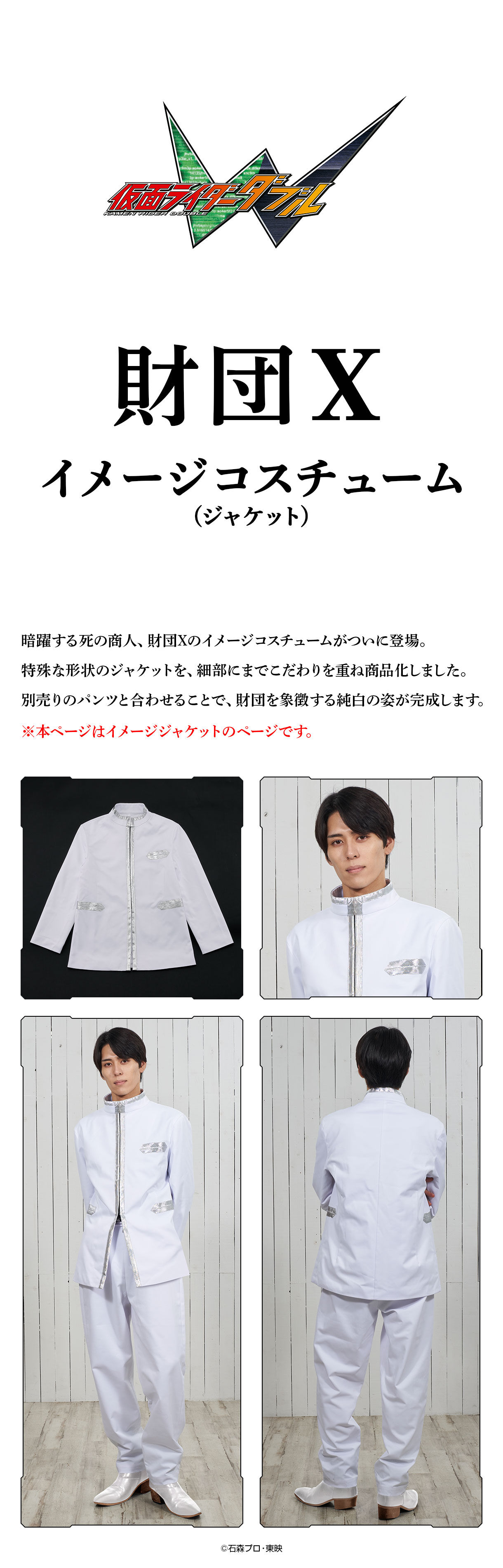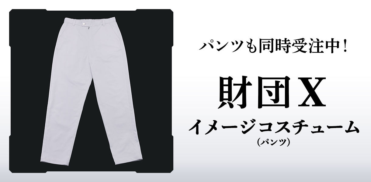 暗躍する死の商人、財団Xのイメージコスチュームがついに登場。 特殊な形状のジャケットを、細部にまでこだわりを重ね商品化しました。 別売りのパンツと合わせることで、財団を象徴する純白の姿が完成します。