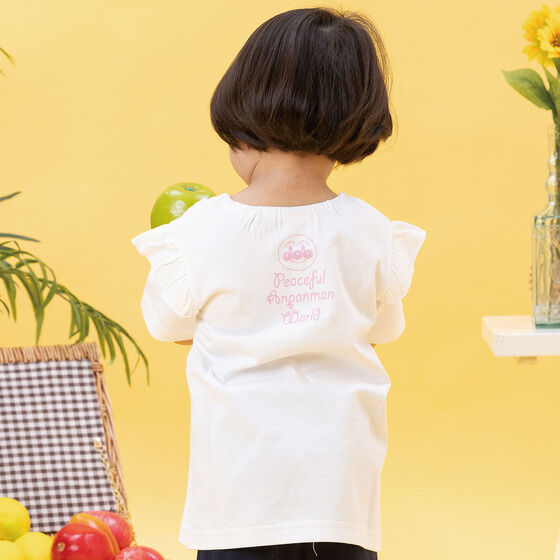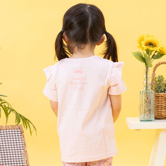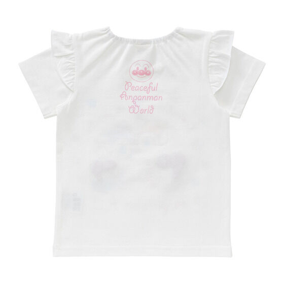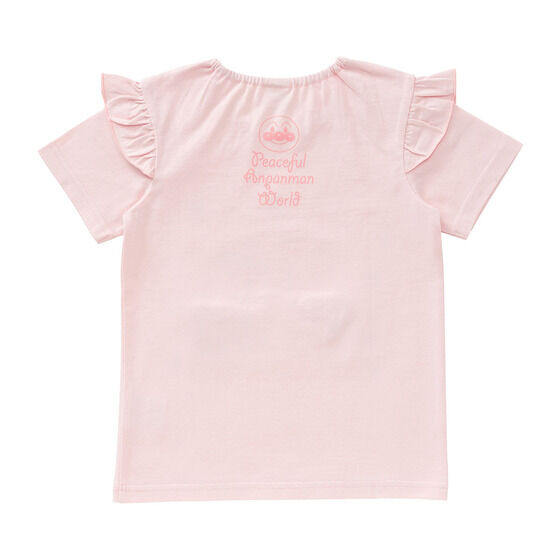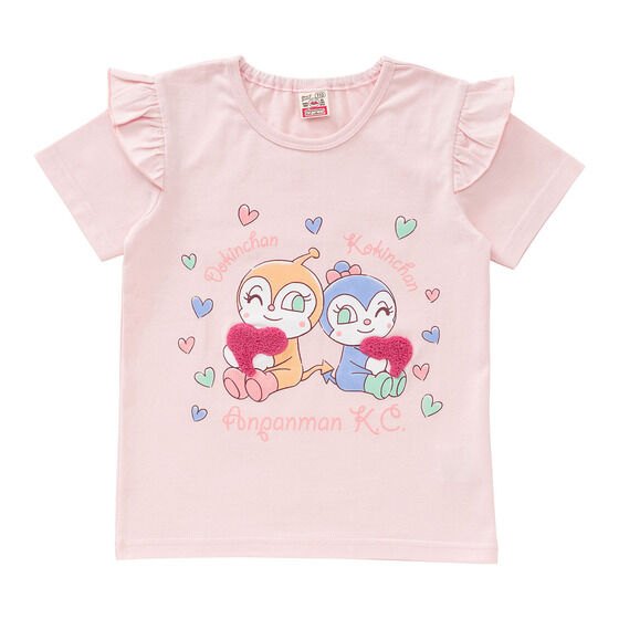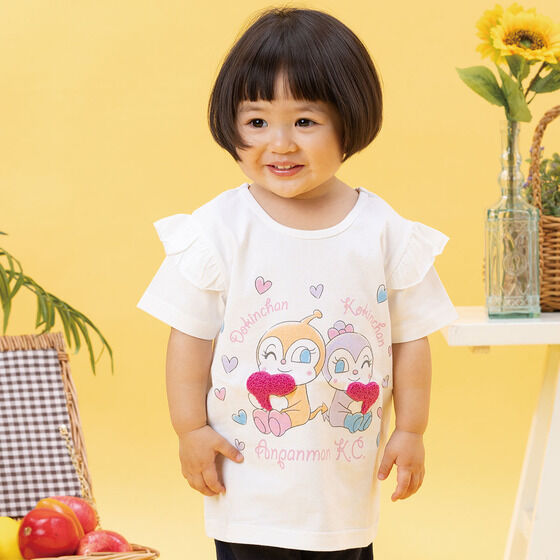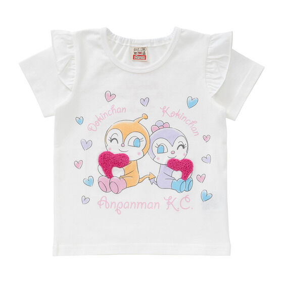 ふんわりタッチで描かれたドキンちゃんとコキンちゃんがかわいい半袖Tシャツ! ドキンちゃんとコキンちゃんはプリントで表現し、手に持ったハート部分には、ふわふわとした触り心地のさがら刺繍が施されています。 バックにはアンパンマンのデザインがプリントされています。 肩にはフリルをあしらい、シルエットまで可愛らしく仕上げた一枚です。
