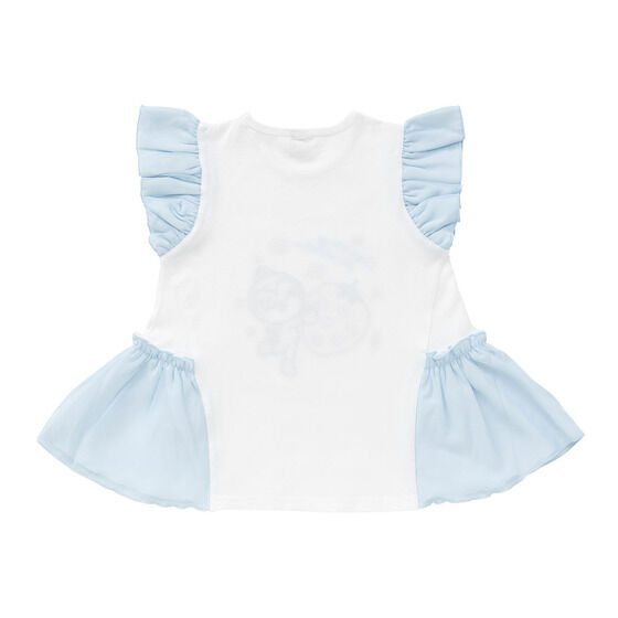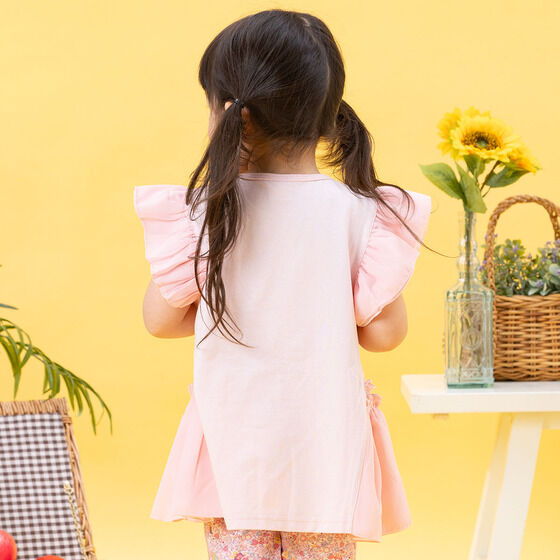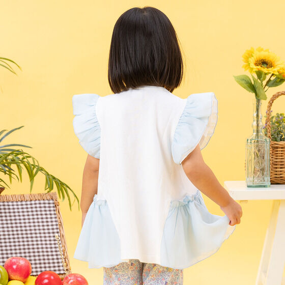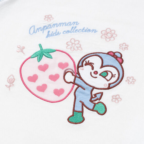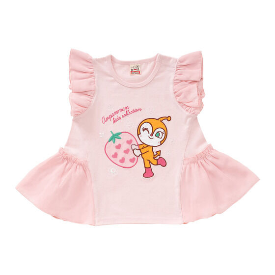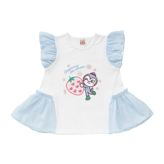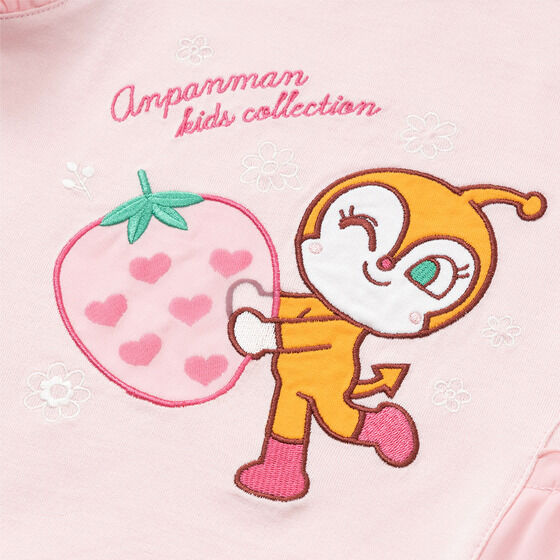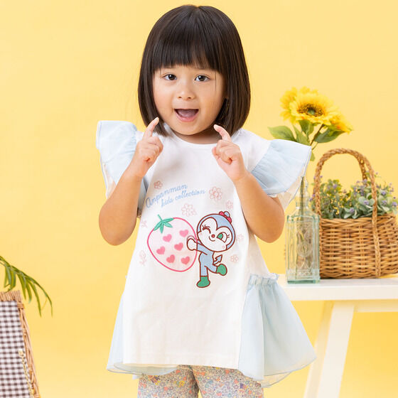 たっぷりフリルが付いたシルエットがかわいい半袖チュニック! ピンク配色はドキンちゃん、サックスブルー配色はコキンちゃんのアップリケ刺繍がデザインされています。 いちご部分は透け感のあるオーガンジー生地で表現されているのがポイント。