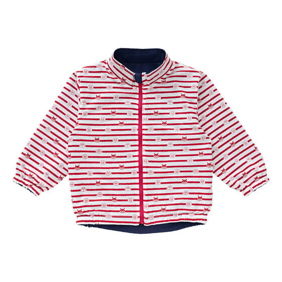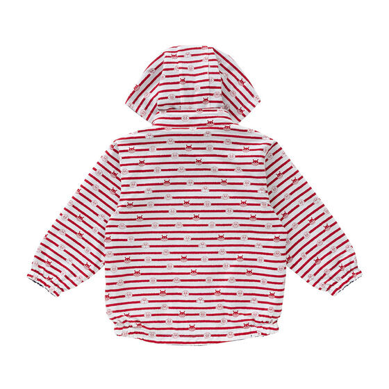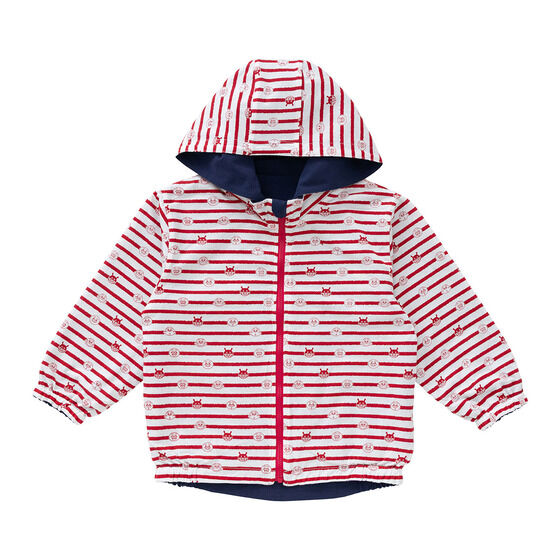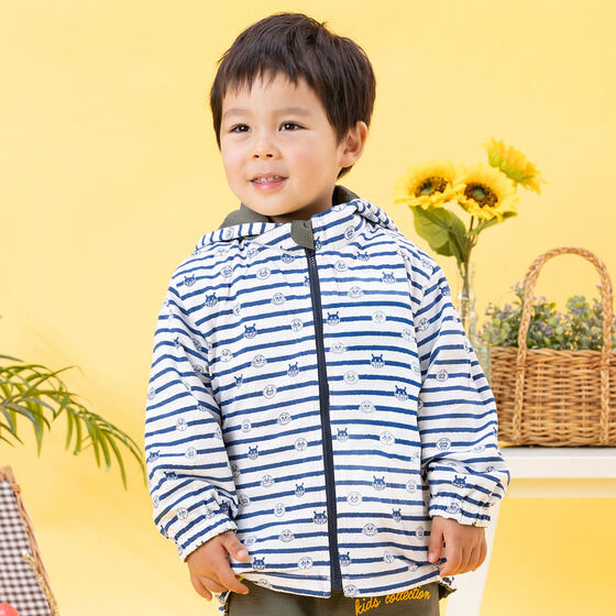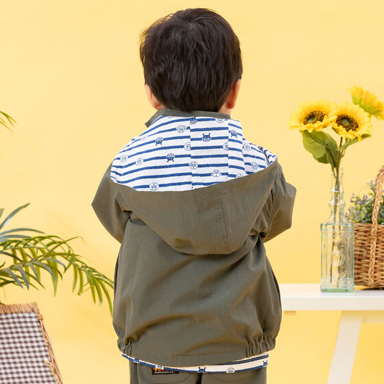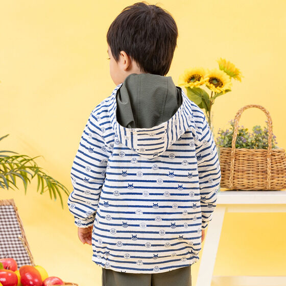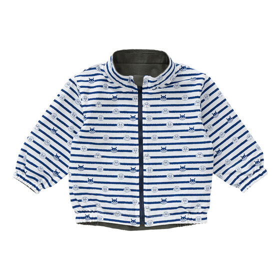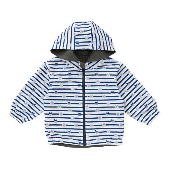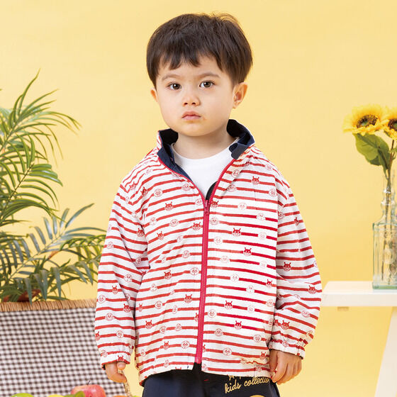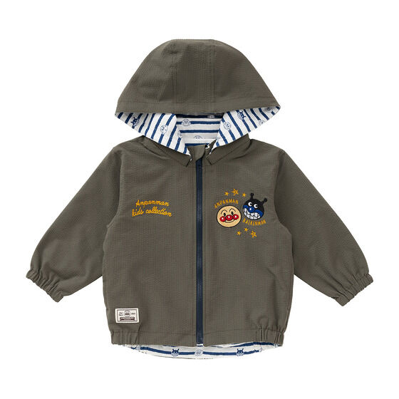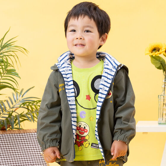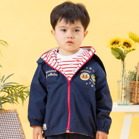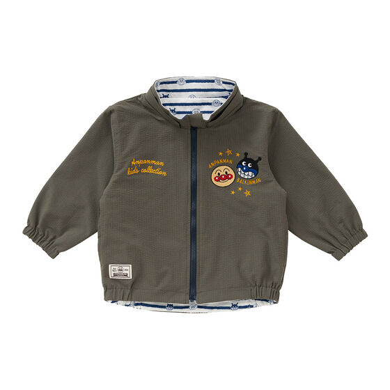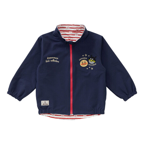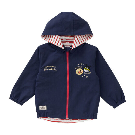 リバーシブルで使えるジャケット! 表地は軽くて動きやすいサッカー素材に、アンパンマンとばいきんまんの刺繍がデザインされています。 裏地は綿100%素材に、アンパンマンたちのお顔とボーダー柄がプリントされており、着心地抜群の1枚です。 フードは取り外し可能で通園やお出かけにも使いやすいところもポイント。