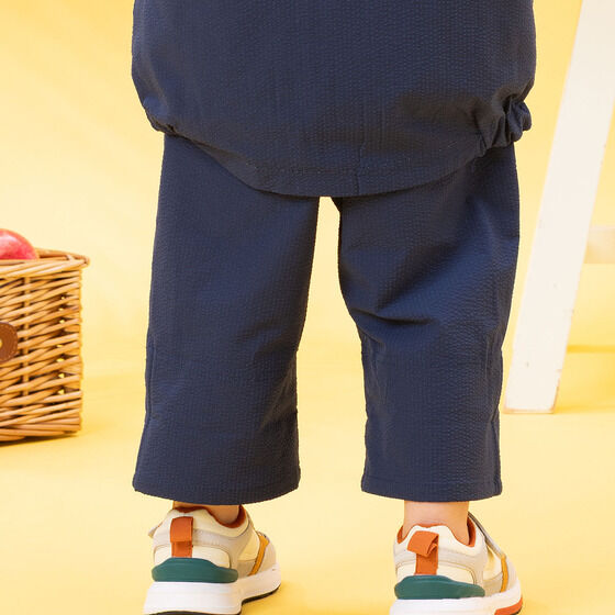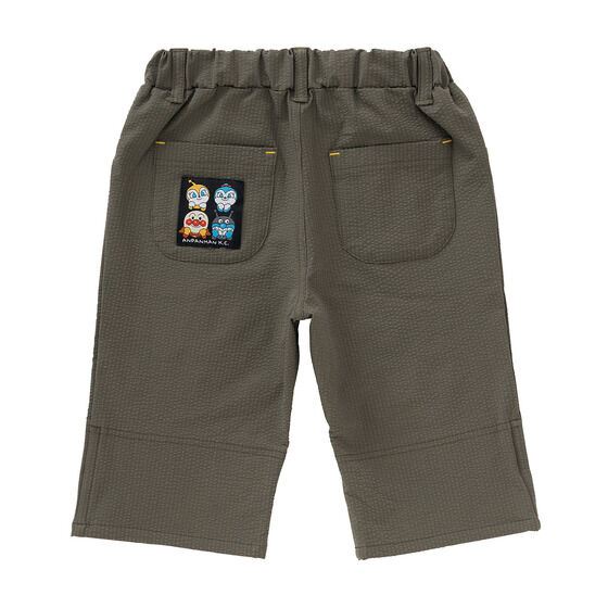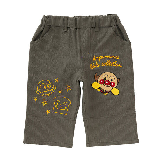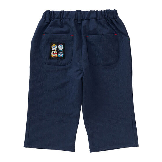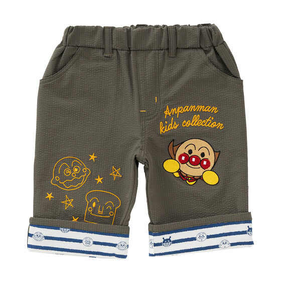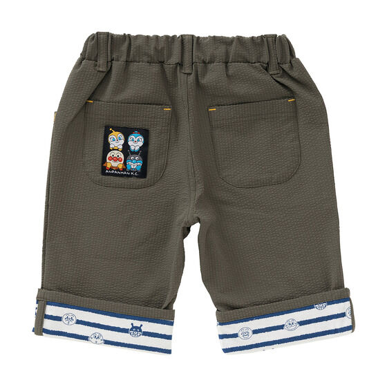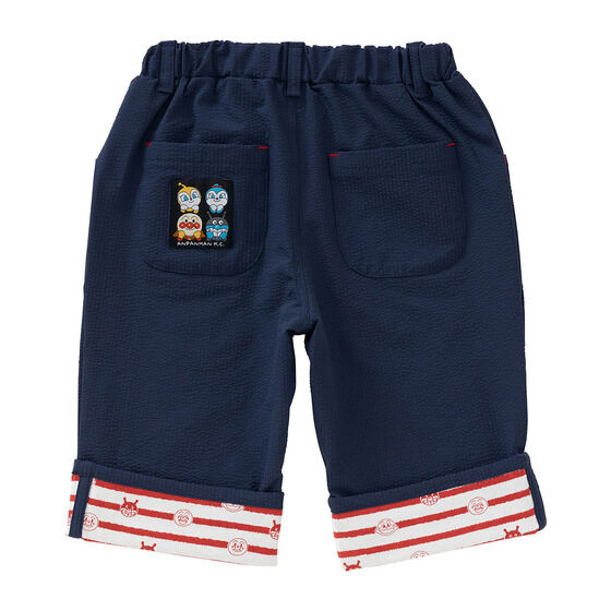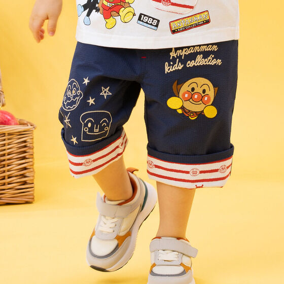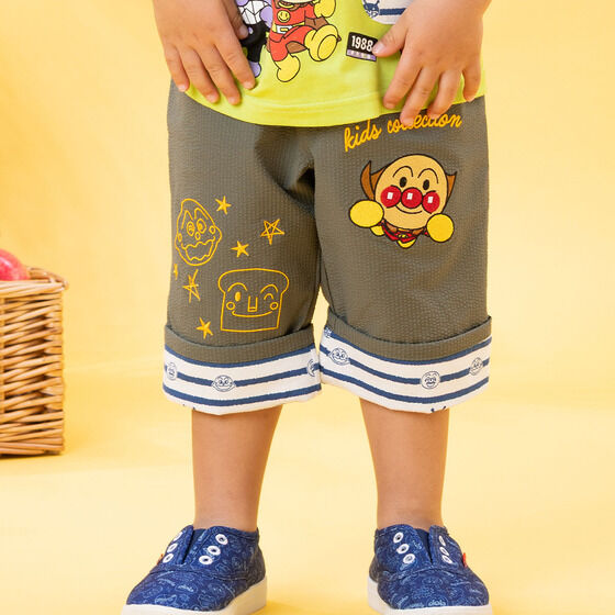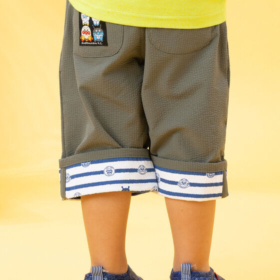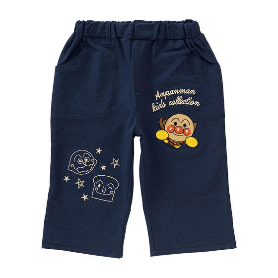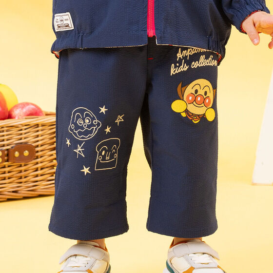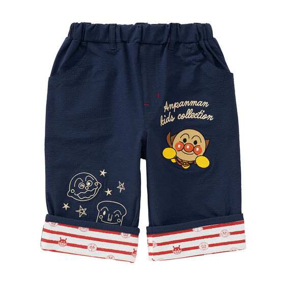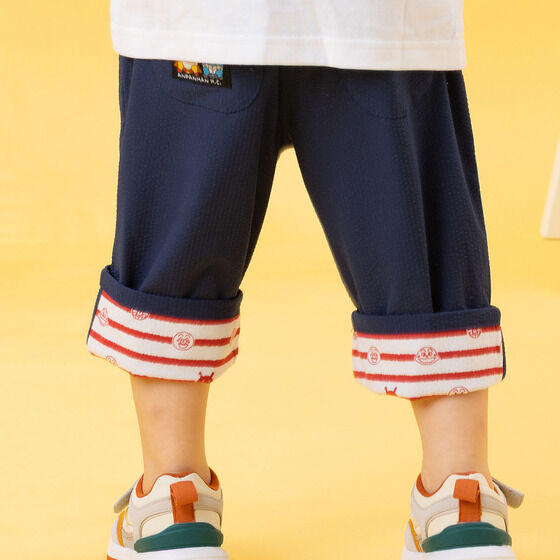 軽やかなサッカー素材を使用した6分丈のボトム! 左足にはアンパンマン、右足にはカレーパンマンとしょくぱんまんの刺繍が施されています。 裾は折り返し可能でお子様の成長に合わせて長くご着用いただけます。 折り返し部分のアンパンマンたちのお顔がプリントされたボーダー柄もポイント。
