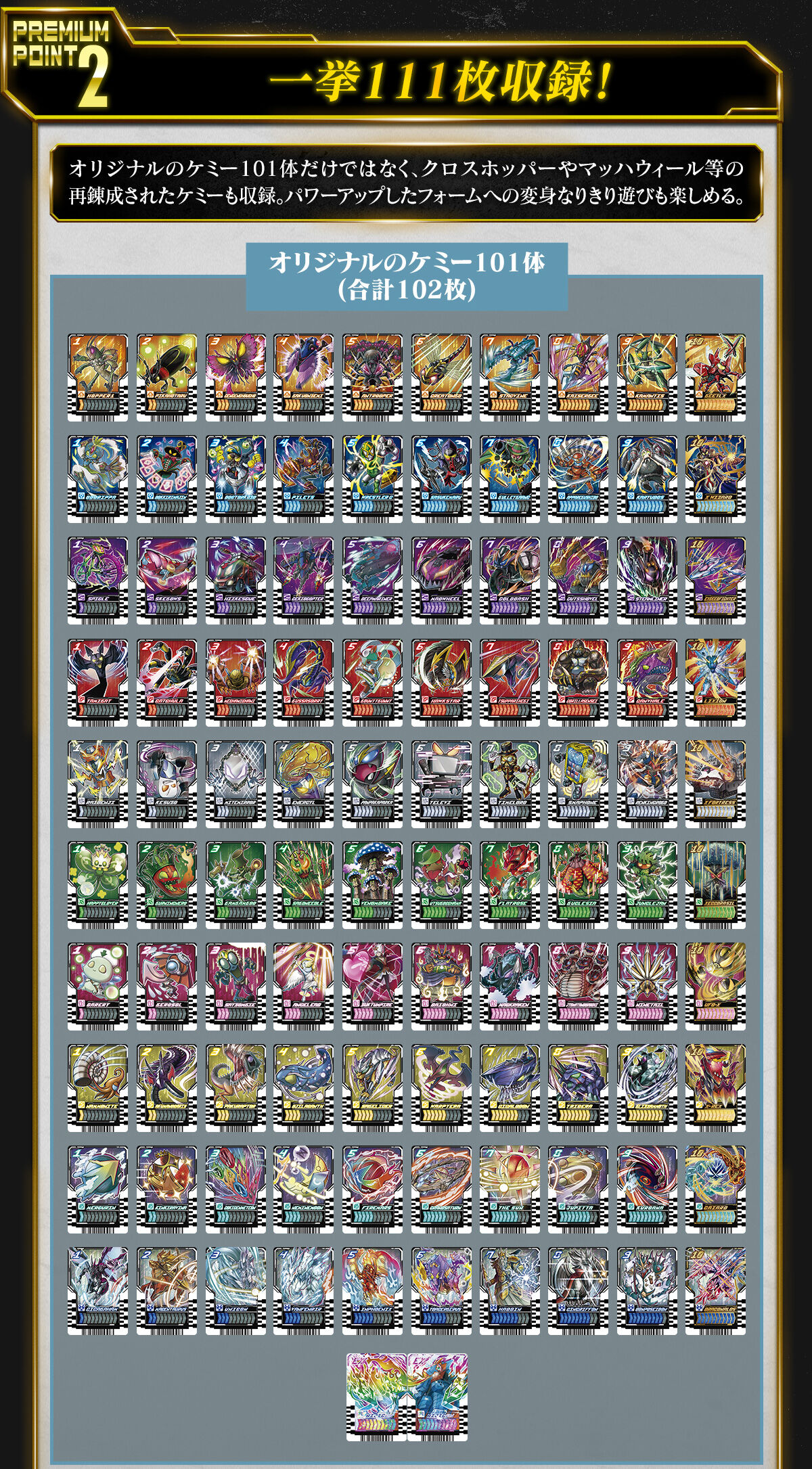 デザインの調整を加えたうえで、本商品にはプラスチック製ライドケミートレカを一挙に111枚収録。オリジナルのケミー101体に加え、「クロスホッパー」「テンライナー」「マッハウィール」など再錬成されたケミーもラインナップ。パワーアップしたフォームへの変身なりきり遊びも楽しめます。