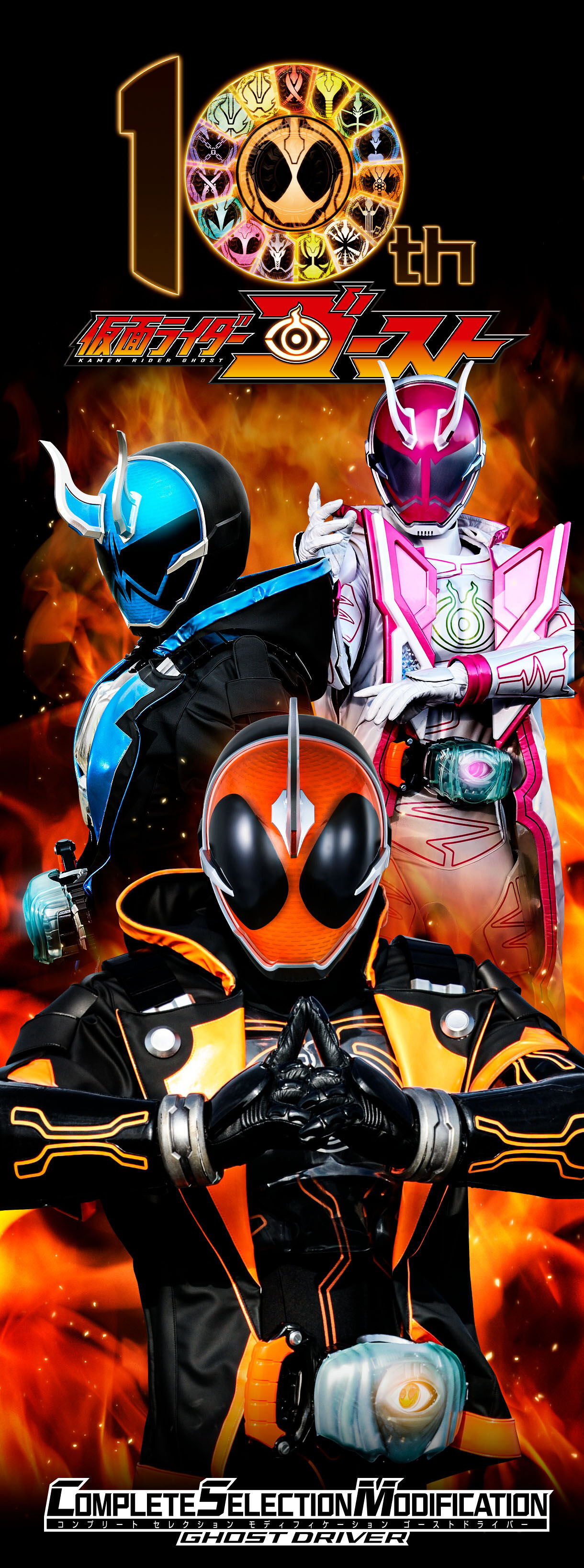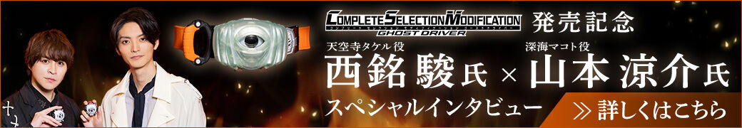 『仮面ライダーゴースト』放送10周年を記念して、変身ベルト「ゴーストドライバー」を大人のための変身ベルトブランド「COMPLETE SELECTION MODIFICATION(略称:CSM)」シリーズで初商品化いたします。 セットにはDX版から様々なアップグレードを施した「ゴーストドライバー」に加え、「オレゴースト眼魂」「スペクターゴースト眼魂」「カノンスペクターゴースト眼魂」が付属。3人の仮面ライダーの変身再現が楽しめます。 ゴーストドライバー本体は、DX版から造形・塗装をアップデートし、より劇中のイメージに近い外観を実現。正面の透明パーツはパールカラー、内部ディテールはシルバーカラーなど、本体全面に塗装を施し、重厚感を増した外観となりました。付属するゴースト眼魂についても、DX版ではホログラムだったステッカーをメタリックな仕様に変更し、背面のQRシール・刻印を取り除くことで、劇中のイメージに近づけました。 また、電源ON時の操作で3モードの切り替えが可能。天空寺タケル(演:西銘駿)の台詞が発動可能なゴーストモード、深海マコト(演:山本涼介)の台詞が発動可能なスペクターモード、深海カノン(演:工藤美桜)の台詞が発動可能なカノンスペクターモードを搭載しています。各台詞は本体底面に新設された台詞ボタンを押すことで発動可能です。スペクターモードでは、変身待機音がスペクター専用のもので固定され、スペクターゴースト眼魂以外をセットした際も「仮面ライダースペクター」としてのなりきり遊びが楽しめます。 台詞ボタンのほかに、天面にBGMボタンと効果音ボタンの2つを増設。効果音ボタンでは「ベルト出現音」「ゴースト眼魂起動音」などのなりきり遊びを彩る効果音のほか、変身中のフォームに合わせた個別必殺音なども発動可能です。BGMは主題歌「我ら思う、故に我ら在り」をはじめ9曲を収録しています。 さらに台詞ボタンの操作では3人の変身者のほかに、ユルセン(演:悠木碧)・英雄ゴースト(演:関智一)の台詞も発動可能。劇中の印象的なやりとりがよみがえります。 また、本商品と連動可能な「CSM15英雄ゴースト眼魂セット」の商品化が決定。今後の『仮面ライダーゴースト』関連商品の展開にもご期待ください。 ※本商品に付属するゴースト眼魂は、当時の「DXゴーストアイコンシリーズ」と同じ規格で作られておりますが、本商品に「DXゴーストアイコンシリーズ」を装填した場合の動作は保証しておりません。あらかじめご了承ください。 ※「DXゴーストドライバー」に、本商品に付属するゴースト眼魂を装填した場合の動作は保証しておりません。あらかじめご了承ください。
