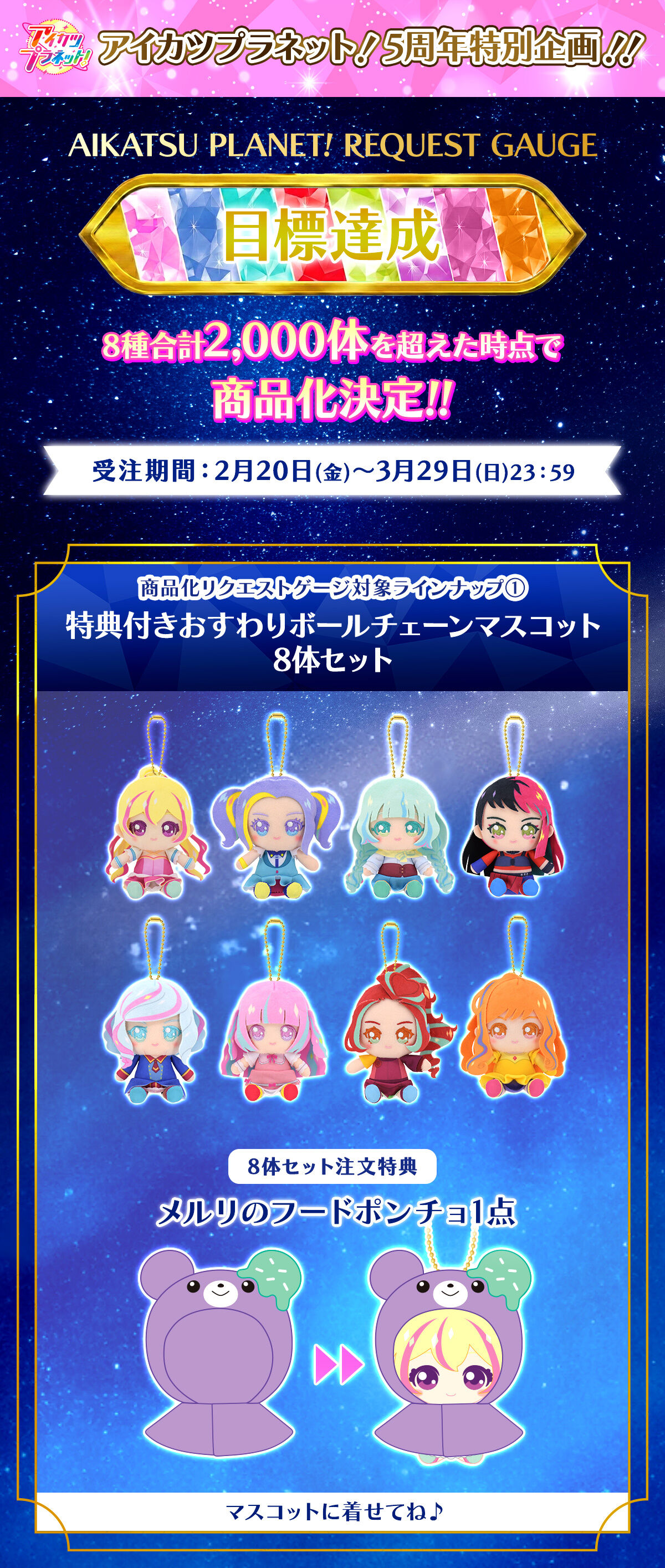 ↓↓↓↓お申込みボタンは一番下↓↓↓↓ アイカツプラネット!5周年記念! おすわりボールチェーンマスコットにアイカツプラネット!の8人が登場★ ■本商品は、リクエスト企画商品<おすわりボールチェーンマスコット〜特典付きコンプリートセット〜>の注文ページです■ 受付期間:2026年2月20日(金)10時〜2026年3月29日 (日) 23時 ハナ・ルリ・キューピット・ビート・シオリ・アン・サラ・ローズのマスコット8種と、 特典”メルリのフードポンチョ”1点がついたお得なセット商品です♪ リクエスト注文期間中に、セット販売・単品販売あわせて8種計2,000体注文達成で商品化! ※<特典付きコンプリートセット>1セット注文で8体、<単品>1体注文で1体のカウントです。 #プラネットぬいで情報拡散してくださいね♪ 【生産エリア】 中国