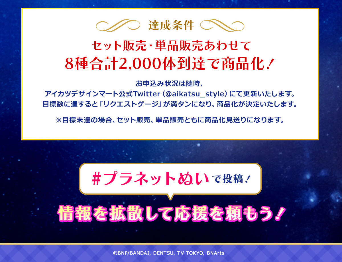 【サイズ】約H12.5cm ※ストラップ含まず【対象年齢】15才以上 ■本商品は、リクエスト企画商品です■ 受付期間内に特典付きコンプリートセットと単品販売のリクエスト個数が合計2,000個に達した時点で商品化が決定し、 リクエストいただいた個数のご注文が確定となります。 目標数量に達しなかった場合にはコンプリートセット販売・単品販売ともに商品化は見送り・お申込みは無効となりお客様のご注文履歴を取り消しさせていただきます。 【応募状況・結果発表】 リクエスト状況は、特典つきコンプリートセット販売ページのリクエストゲージにてご注文期間中に50%・100%の進捗で更新を予定しております。 上記以外のタイミングでの注文進捗は、アイカツ!デザインマート公式X(https://twitter.com/aikatsu_style)にて随時ポスト予定です。 なお、商品化決定の際には公式Xや、本ページにて告知させていただきます。 結果発表: 2026年3月末ごろを予定 【応募方法】 受付期間中に本ページからお申込みください。 お申し込みは、各リクエストアイテムごとにお一人様1回となります。お申し込み完了後リクエスト受付期間中であれば最大30個まで数量の変更が可能です。 【応募に関する注意】 リクエスト企画はアンケートではございません。お申し込み完了後のキャンセルは一切お受けできませんのでご注意ください。 リクエスト達成時点でお申し込み数量分のご注文が確定いたします。 リクエスト完了後のキャンセルはお断りさせていただきますのでご了承ください。 リクエスト状況などの、個別のお問い合わせには回答できません。 【リクエスト達成後】 商品の発送は≪2026年7月≫を予定しております。 ※リクエストされた方に「【プレミアムバンダイ】リクエスト商品についてのご連絡(自動配信)」の件名でメールが送信されます。 ご注文は一旦「代金引換」にて承りますが、メール記載の期限までにマイページからクレジットカード(出荷時決済)、Amazon Pay、プレバンPayの決済方法にご変更をお願いいたします。 また、おまとめ操作も上記メールが送信されたのちにマイページより可能となります。2026年6月末までにおまとめの申し込みが可能です。 おまとめしない場合、各商品毎に送料がかかりますのでご注意ください。 ※本商品のお申込みはお一人様1回です。 ※注意事項をよんでからご応募ください。