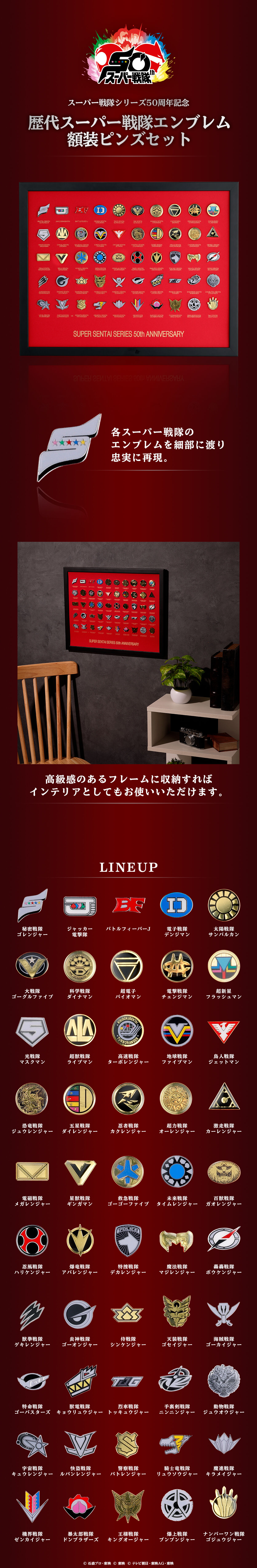 秘密戦隊ゴレンジャーからナンバーワン戦隊ゴジュウジャーまでの歴代エンブレムの額装ピンズセット。 お部屋に飾れる額縁入りの豪華仕様です。 対象年齢:15歳以上 【サイズ】 ピンズ1個あたり:約30mm ※エンブレムにより若干かわります。 額縁:高さ35.5cm 幅45.5cm 奥行3cm 【素材】 ピンズ:亜鉛合金 額縁 本体:木材 窓部分:アクリル ■生産エリア:中国 ※掲載の商品写真は試作品のため、実際の商品と異なる場合がございます。 ※加工のイメージは画像と若干異なる場合があります。 ※額縁は壁掛け用となっております。 ※ピンズは飾って鑑賞するための額装用です。 ピンズ裏面には針以外にも回転防止用の尖ったツメがありますので、取り外しの際は怪我をしないよう、十分ご注意ください。 ※アクリル板を使用しております。アクリルは軽くて割れにくい反面、表面に細かい傷がつきやすいです。 ※外袋、外箱につきましては、商品の梱包材となりますため、本体に影響を及ぼすような凹み、破損を除き、汚れや傷などでの交換は出来かねます。 |