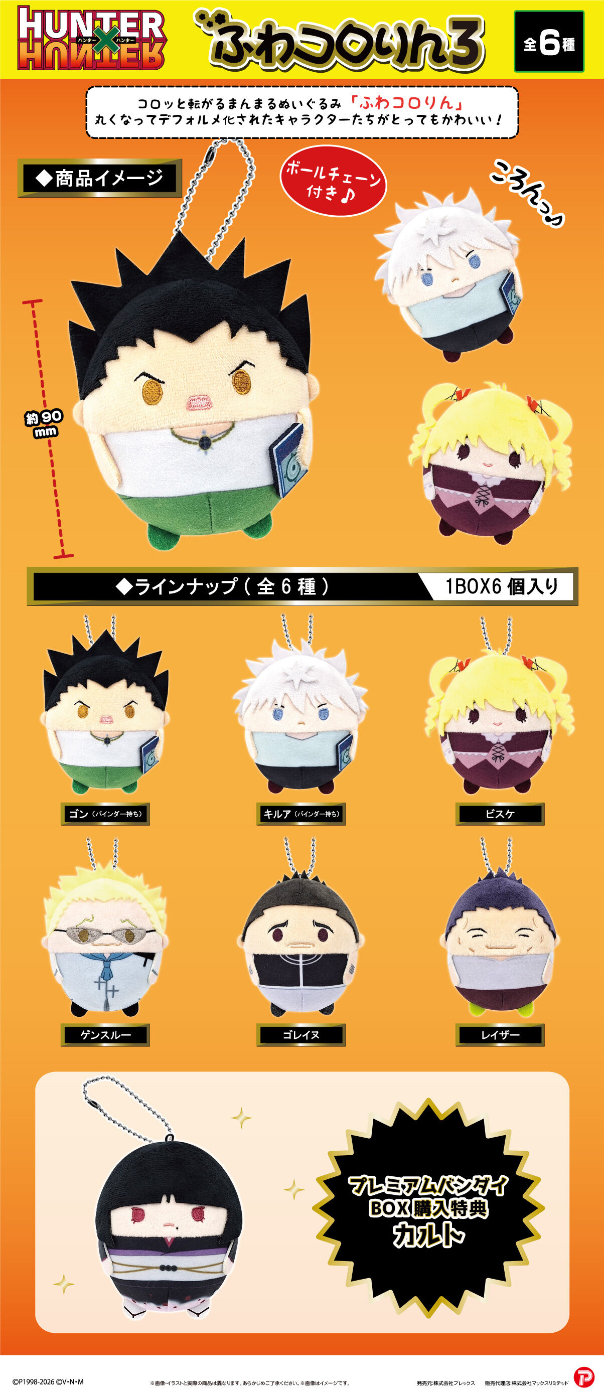 コロッと転がる、まんまるでふわふわコロっとした全長約9cmのデフォルメぬいぐるみマスコット! 【商品名】HUNTER×HUNTER ふわコロりん3 【商品の取り扱い】全国ホビー店、アニメ雑貨専門店での取り扱いがございます。 ※店頭では単品販売(クローズドボックス)の予定です。 ※プレミアムバンダイ限定特典付きの本商品は26年7月発送予定となりますが、 一部店舗では、26年6月中に店頭に並ぶ場合がございます。 【ご注文受付数】1注文につき6セットまで 【発売元】株式会社プレックス ※本商品は2024年5月発売商品の再販商品となります。 ※原材料や工賃の値上げの状況で、誠に不本意ではございますが、品質の維持・向上のため、商品価格を改定させていただくことになりました。 ※写真と実際の商品は多少異なる場合がございます。 ※本商品は準備数に限りがございます。準備数に達した場合、早期にご注文の受付を終了させていただくことがございます。 ※注文期間は予告なく変更となる場合があります。 |