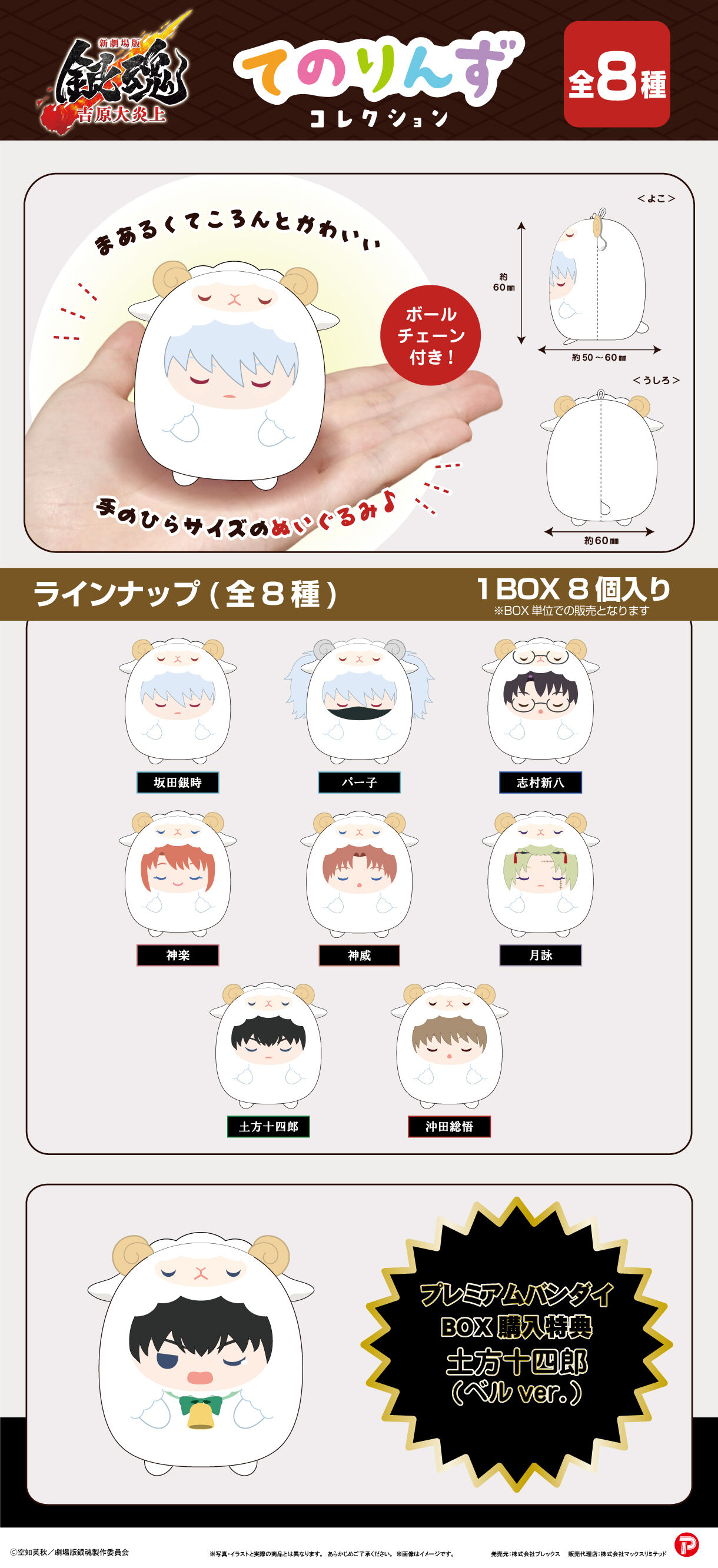 キャラクターたちが羊の着ぐるみを着てスヤスヤと寝ている様なデザインの、手のりサイズのぬいぐるみマスコット 【新劇場版 銀魂 –吉原大炎上- てのりんずコレクション】が新登場! プレミアムバンダイでBOX購入していただくと、購入特典として【土方十四郎(ベルver.)】が付属します! 【商品名】新劇場版 銀魂 -吉原大炎上- てのりんずコレクション <ラインナップ> 坂田銀時/パー子/志村新八/神楽/神威/月詠/土方十四郎/沖田総悟 ※1BOXで全種揃います。 <プレミアムバンダイ BOX購入特典> 土方十四郎(表情替え) 【価格】7,744円(税込)※BOX単位での販売となります。 【種類数】全8種 【本体サイズ】全長約60mm 【本体材質】ポリエステル 【対象年齢】15才以上 【商品の取り扱い】全国ホビー店、アニメ雑貨専門店などでの取り扱いがございます。 ※店頭では単品販売(クローズドボックス)の予定です。 ※プレミアムバンダイ限定特典付きの本商品は26年7月発送予定となりますが、 一部店舗では、26年6月中に店頭に並ぶ場合がございます。 【ご注文受付数】1注文につき6セットまで 【発売元】株式会社プレックス ※写真と実際の商品は多少異なる場合がございます。 ※本商品は準備数に限りがございます。準備数に達した場合、早期にご注文の受付を終了させていただくことがございます。 ※注文期間は予告なく変更となる場合があります。 |