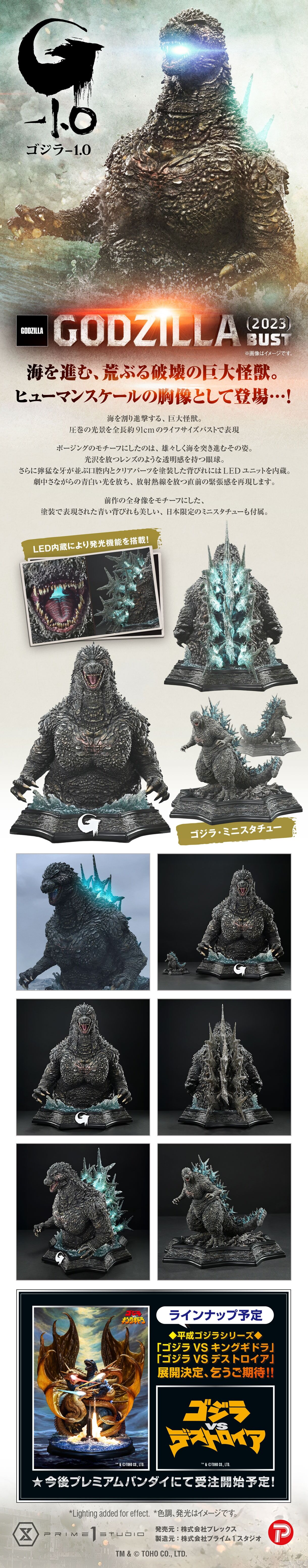 「プライム1スタジオ」製造の『ゴジラ-1.0』巨大ジオラマが「マルピーガレージ」より発売決定! −−−−−−−−−−−−−−−−−−−−−−−−−−−−−−−−−−−−−−−−−−−− 海を割り進撃する、巨大怪獣。 圧巻の光景を全長約91cmのライフサイズバストで表現 革新的なVFX技術と深みのある人間ドラマにより、世界中でヒットを記録した『ゴジラ-1.0』。 この怪獣王の70周年記念作品より、ライフサイズバストが登場。 マルピーガレージにて2024年に発売した全身像(製造:プライム1スタジオ)は、破壊された建物や逃げ惑う人々を配した、「怪獣に襲われる恐怖」をテーマとするジオラマ作品でした。 本作はその造形と彩色を受け継ぎつつ、焦点を「怪獣の巨大さ」に当てた、全高約87cm、奥行約91cmのライフサイズバストです。 ポージングのモチーフにしたのは、海を割り進撃する姿。腰回りに荒れた波しぶきをまとわせ、水面下にある下半身の動きも想起できるように仕上げました。 建物や人間といった要素をあえて排除し、ゴジラそのものの質量と圧力に没入できる構成に設計されています。 生物の濡れたような光沢を放つ、レンズのような透明感を持つ眼球。 筋肉の起伏を作り込んだ、逞しい胸部や腕回り。深海で過ごした時間を連想させる、暗く沈んだ体表の色。 胸像を構成する一つひとつに、造形・彩色技術の粋を注ぎました。 さらに獰猛な牙が並ぶ口腔内とクリアパーツを塗装した背びれにはLEDユニットを内蔵。劇中さながらの青白い光を放ち、放射熱線を放つ直前の緊張感を再現します。 そして前作の全身像をモチーフにした、ミニスタチューも付属。 塗装で表現された青い背びれも美しい、日本限定のコレクターズアイテムです。 大洋を悠然と進む巨大怪獣。新たなゴジラ映画の金字塔で目撃した、圧巻の光景をコレクションルームで体感してください。 −−−−−−−−−−−−−−−−−−−−−−−−−−−−−−−−−−−−−−−−−−−− ※この商品のお届けは来年(2026年)6月を予定しております。 ※この商品は、お申込状況、生産の都合により、注文期間や発送日が変更となる場合がございます。 予めご了承ください。 【ご注意】※ご購入前に必ずご確認ください※ ※大きな商品となるため、ご自宅に設置できるかご確認をお願い致します。 商品サイズ:全高約:87cm 全幅約:68cm 奥行:約91cm ※ご自身での組み立てが必要です。 ※この商品は重量の都合により3個口でお届けいたします。 ※本商品にはUSBケーブル/ACアダプター等は付属しません。 ・家電量販店で販売されている規格に合うACアダプターを別途お買い求めください ・すでにご家庭で使用されているほかの家電等のACアダプターは使用しないでください。 新たにご用意いただいた規格に合うものをご使用ください。 ■購入制限について 本商品は、お一人様一点までご購入いただけます。 送料は全国一律15,000円(税込)(3個口分) です。(当店への返送料15,000円+当店からの再送料15,000円) 【セット内容】 ・ゴジラ・ミニスタチュー …1 【製品仕様】 ・LED発光ギミック(口腔、背びれetc.) 【素材】 ポリストーン、他 【サイズ】Non Scale ライフサイズバスト:全高約87cm 全幅約68cm 奥行約91cm ミニスタチュー:全高約18cm 全幅約21cm 奥行約19cm 【パッケージサイズ】 カートンA:78cm×84cm×29cm カートンB:62cm×68cm×61cm カートンC:46cm×68cm×45cm 【製品重量】 約47.7kg 【生産エリア】 中国 【対象年齢】 15才以上 【発売元】 株式会社プレックス 【製造元】 株式会社プライム1スタジオ |
