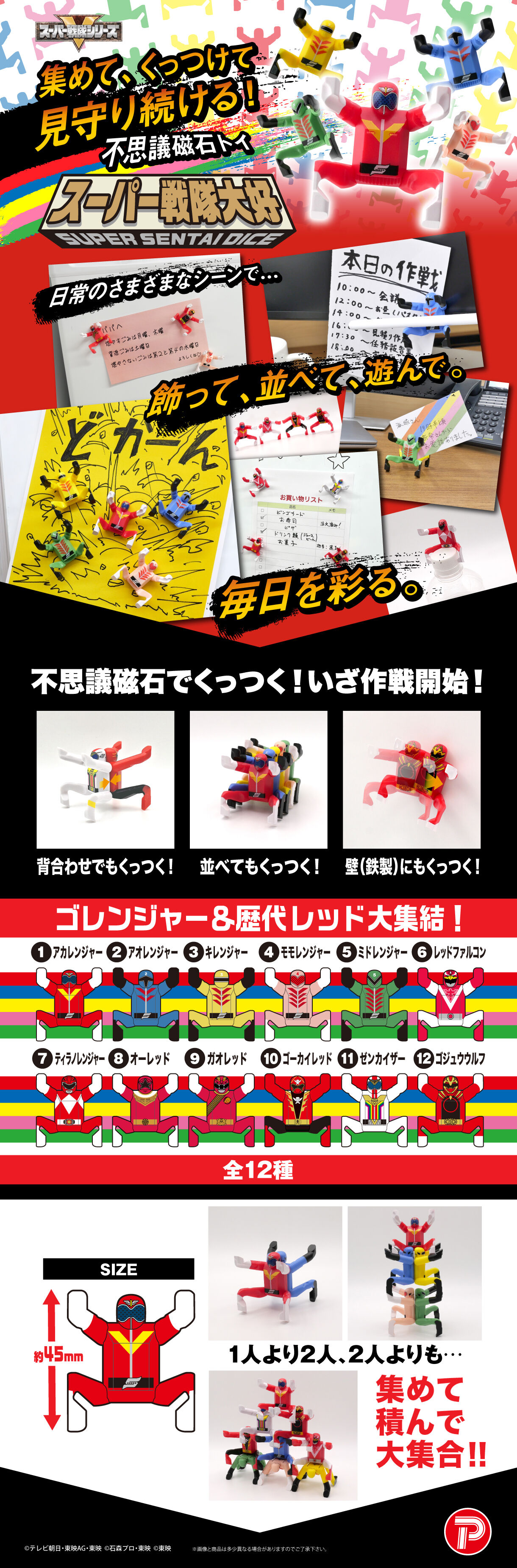 スーパー戦隊シリーズのキャラクターたちが、全高約45mmの「人間大好」になって登場! 身体を沈め、両腕を正面へと鋭く構えた姿勢を採用することで、敵に立ち向かう緊張感と力強さを、コンパクトなフォーマットの中で表現しています。 不思議磁石でくっつく!人型フォーマットフィギュア「人間大好(にんげんだいす)」 あらゆるキャラクター表現に対応する、人型フォーマットの立体フィギュアです。 背面のフラット構造と内蔵されたネオジウム磁石により、連結展示やスチール面へ設置ができ、 机上・棚・壁面など、日常の空間を自由に演出できます。 並べる、組み合わせる、くっつける、飾り方はあなた次第。 それが「人間大好(にんげんだいす)」です。 いつでも両手を広げて、あなたの世界を受け止めます。 【セット内容】 ディスプレイボックス 本体:12個