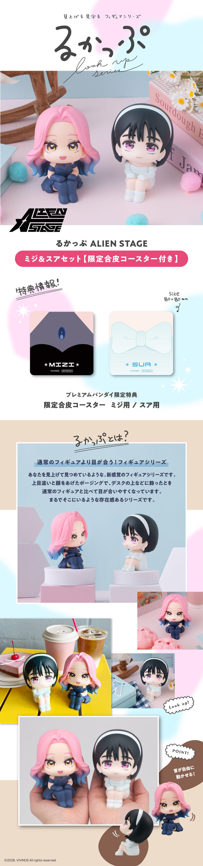 るかっぷ シリーズに、いま話題の韓国発の『ALIEN STAGE』から「ミジ」と「スア」が登場です。 るかっぷは「look up」を元にした造語で、見上げ&おすわりポーズが特長の人気フィギュアシリーズです。 デスクの上などに飾ったとき、通常のフィギュアと比べて目が合いやすくなっています。 首は可動で表情をつけて楽しむことができます。 ❝限定合皮コースター❞が付属しているのはプレミアムバンダイ限定ですので、ご予約をお忘れなく! ------------------------------------------------------------------------------------------------ 原型/彩色:ピンポイント 【セット内容】 ・彩色済み完成品フィギュア…2 ・オリジナルコースター…2 【商品素材】 本体:PVC コースター:合皮 【対象年齢】 15才以上 【商品サイズ】 ミジ:全高約110mm スア:全高約110mm 【ご注文受付数】 お一人様3個まで ※ご注文1回につき、1個購入可。3個購入時は3回分の手続きが必要。 【商品の取り扱い】 プレミアムバンダイ ※「オリジナルコースター」付き商品はその他一般小売店での販売はございません。 【決済方法】 クレジットカード(出荷時決済)、Amazon Pay、 PayPay、プレバンPay、あと払い(ペイディ)のみのお取り扱いとなります。
