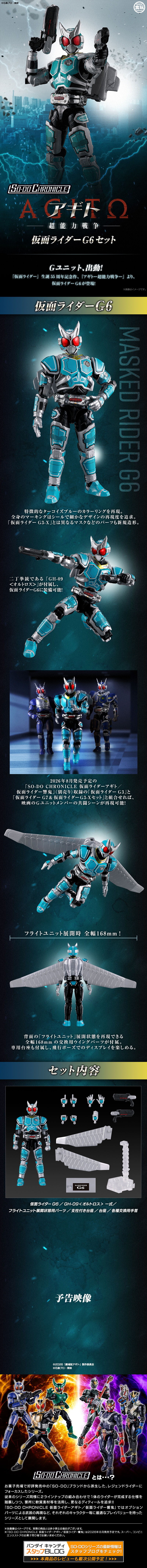 仮面ライダー生誕55周年記念作『アギトー超能力戦争ー』に登場する仮面ライダーG6がSO-DO CHRONICLEのラインナップに登場。 背中のフライトユニットと飛行ポーズを支えるための専用台座が付属。