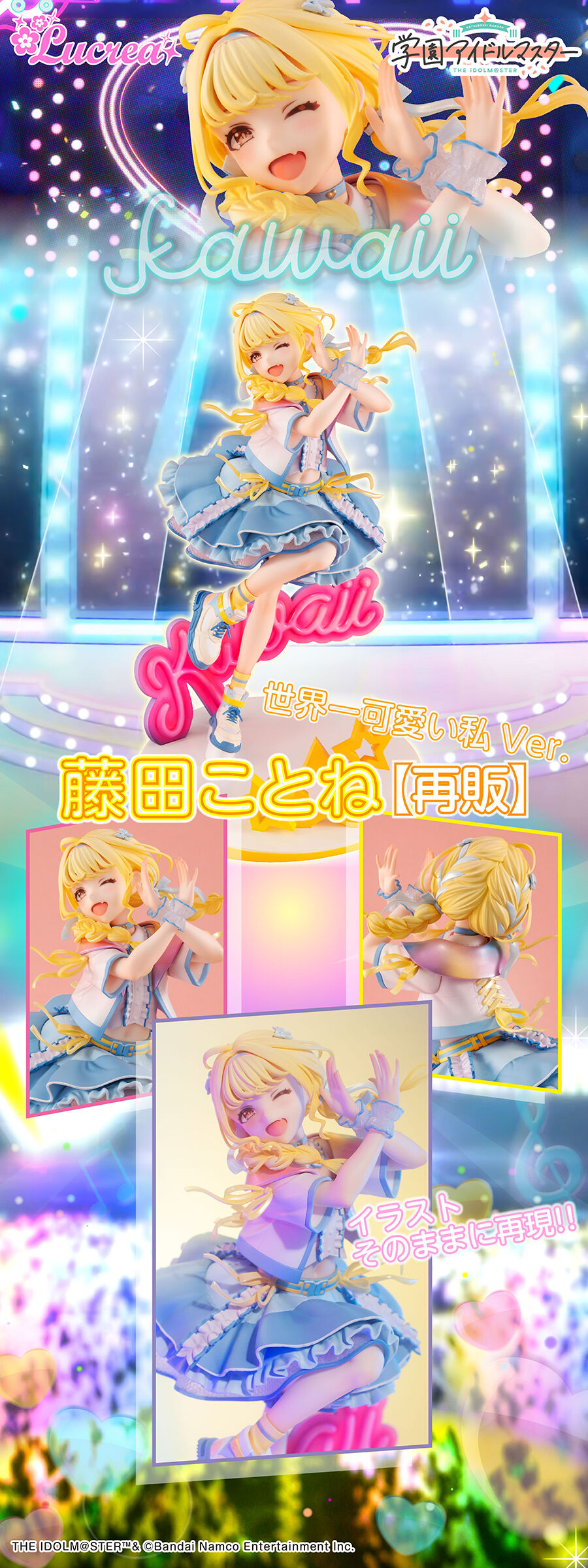 Lucreaシリーズにて1/7スケールで立体化した 『学園アイドルマスター』藤田ことねが再登場!! ゲーム内のSSRカード【世界一可愛い私】をモチーフに 元気いっぱいで可愛いらしさ溢れることねの魅力を再現いたしました! 身にまとっているアイドル衣装はパステルカラーを 基調とし透き通るような明るい雰囲気を感じさせつつ、 ヘアバンドや襟には印象的なオーロラカラーも美しく表現しております。 台座にはライブやステージをイメージし、 ネオンとお星様をかわいく落とし込みことねと合わせてより かわいいを感じられる物になっております! どの角度から見てもことねの可愛さを堪能できる 逸品ですので是非お手元でお迎えしてあげて下さい! ------------------------------------------------------------------------------------------------ 原型:ミロ 彩色:田中しあん(株式会社ピンポイント) 【セット内容】 ・彩色済み完成品フィギュア…1 ・専用台座…1 【商品素材】 PVC、ABS 【対象年齢】 15才以上 【商品サイズ】 全高:約250o 【ご注文受付数】 お一人様3個まで ※ご注文1回につき、1個購入可。3個購入時は3回分の手続きが必要。 【決済方法】 クレジットカード(出荷時決済)、Amazon Pay、 PayPay、プレバンPay、あと払い(ペイディ)のみのお取り扱いとなります。 【商品の取り扱い】 プレミアムバンダイ、ASOBI STORE、あみあみ、,アニメイト、 でじたみん、ボークス、イエローサブマリン(一部店舗除く)、DMM.com 【作品名】 学園アイドルマスター 【発売元】 株式会社メガハウス ------------------------------------------------------------------------------------------------ ※写真は開発中のものです。 デザイン・仕様は変更になる場合がございますのであらかじめご了承下さいませ。 ※本商品は、他商品と同時にご購入いただくことはできません。 ※生産上の都合により、お届け日が変更となることがございます。あらかじめご了承下さい。 ※注文期間は予告なく変更となる場合があります。 ※本商品は準備数に限りがございます。準備数に達した場合、早期にご注文の受付を終了させて いただくことがございます。 ※ご要望多数の場合、お届け時期を変更し、再度受注を行うことがございます。 ※本商品は、イベントや他の企画および海外等で販売をさせていただく場合がございます。 ※送料・お届けは、全国一律770円(税込み)です。 ------------------------------------------------------------------------------------------------ |