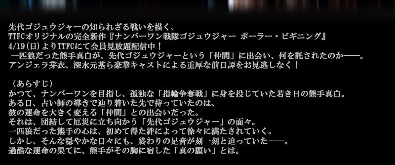 『ゴジュウジャー』より、オルカブースターが暗黒に…! DXオルカブースター5050(ブラックver.)が登場! 限定センタイリングが付属し、独自の音声も発動! ■商品説明 2026年4月に東映特撮ファンクラブで限定配信予定の『ナンバーワン戦隊ゴジュウジャー』スピンオフ作品『ポーラー・ビギニング』に登場予定の、黒いカラーリングが特徴的な「オルカブースター5050(ブラックver.)」をDX玩具として商品化いたします。セットには、本商品限定の「センタイリング テガソードアカツキ(ブラックver.)」も付属します。 オルカブースター5050(ブラックver.)は、劇中のイメージに基づき、「DXオルカブースター5050」とは異なる本体カラー・塗装を再現。独自の音声を収録しており、トリガーを押すことで銃撃音&浸食音が発動。「DXオルカブースター5050」同様、撃鉄操作後にトリガーを引くことで必殺技遊びも楽しめます。 さらに、本商品は別売りの「DXテガソード」や「DXテガソードUNI.ver.」との合体機構を搭載。特徴的な黒いカラーリングで、「DXオルカブースター5050」とは印象の異なる合体遊びが楽しめます。 ■セット内容 オルカブースター5050(ブラックver.)・・・1 センタイリング テガソードアカツキ(ブラックver.)…1 ■商品サイズ オルカブースター5050(ブラックver.)・・・H約145mm× W約160mm× D約275mm センタイリング テガソードアカツキ(ブラックver.)…H約47mm× W約30mm× D約40mm (リングパーツ(小)内径約15mm、リングパーツ(大)内径約21mm) ■対象年齢