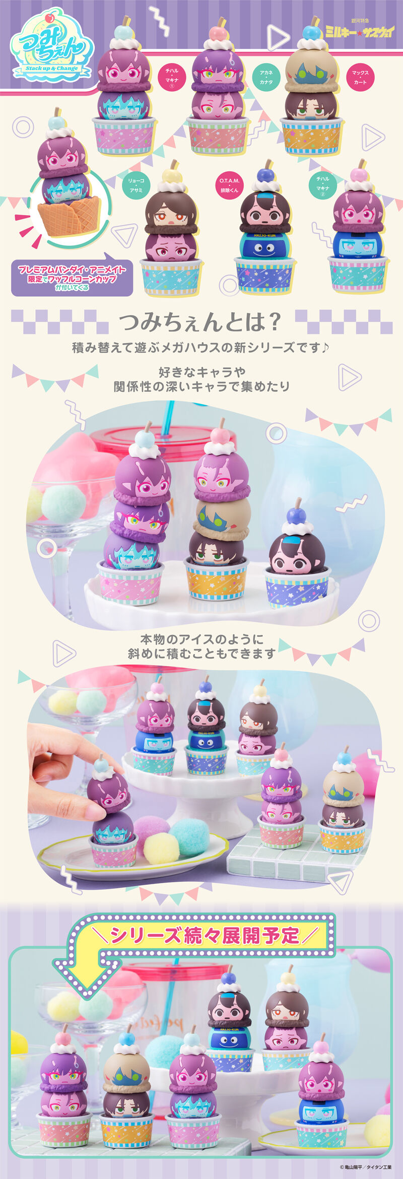 組み替えて楽しめるから沢山集めたくなる!積み上げて飾れるアイスモチーフのマスコットです。 関係性の深いキャラで集めたり、好きなキャラを集めたり、もちろん1個で飾ることもできるので楽しみ方が沢山あります。 【全6種】 @チハル&マキナ(1) Aアカネ&カナタ Bカート&マックス Cリョーコ&アサミ DO.T.A.M.&排除くん Eチハル&マキナ(2) プレミアムバンダイ・アニメイト限定セットとして、ワッフルコーンカップが1個ついてきます。 ------------------------------------------------------------------------------------------------