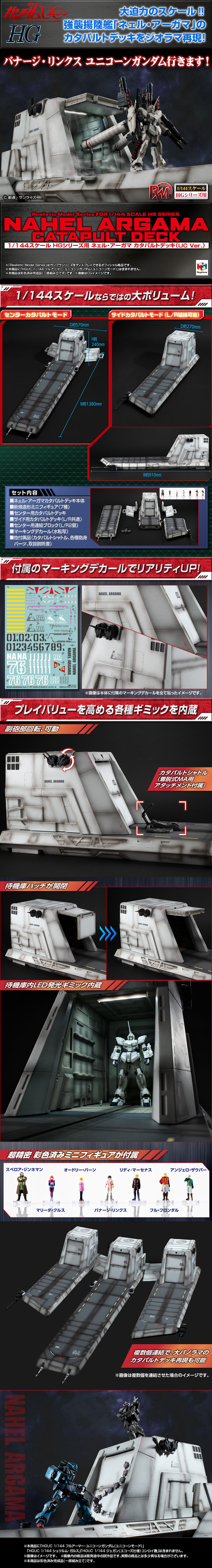 1/144ガンプラHGシリーズ用ディスプレイとしてご好評頂いておりますRMSカタパルトデッキにシリーズ最大級の 「ネェル・アーガマ」カタパルトデッキが新規造形の彩色済みミニフィギュア7種を付属しUC版として再登場! 初心者でも組みやすい彩色済み半完成キット。 精密ディテールとウェザリング塗装により再現されたパネルラインはもとより、遊びを演出するギミックも満載! 作中、特徴的な前方に伸びる3基のカタパルトは先端のデッキパーツを組み替えることで 「センターカタパルトモード」「サイドカタパルトモード(L/R)」を再現する事が可能。 最長138pにも及ぶセンターカタパルトモードは大迫力のロングスケール。 また、発進待機庫はハッチが開閉しMS格納が可能な他、天面にLEDによるライトアップ機能を搭載! お手持ちのガンプラディスプレイをカッコ良く演出します。 回転、可動式の副砲等、付け替え可能な武装パーツも充実。 付属のマーキングデカール(水転写式)はお好みで更なるディテールアップをサポートします。 更にセンターモード時の左右両端ブロックはデッキ連結にも対応。 本商品を複数台連結した場合、作中さながらの3基デッキによる壮大なパノラマディスプレイも実現可能となります。 ディスプレイの楽しさ、MS発進シークエンス、ギミックを体感する楽しさ、 あらゆる魅力が詰まった「1/144ネェル・アーガマカタパルトデッキ」を是非お手元でお楽しみください。 ------------------------------------------------------------------------------------------------ 【セット内容】 ・ネェル・アーガマカタパルトデッキ本体 ・新規造形ミニフィギュア(7種) ・センター用カタパルトデッキ ・サイド用カタパルトデッキ(L/R共通) ・センター用連結ブロック(L/R2個) ・専用マーキングデカール(水転写) ・他付属品:カタパルトシャトル・各種砲身パーツ ・取扱い説明書 ※ボタン電池LR44×3個使用(別売り) 【商品素材】 PS、MABS 他 【対象年齢】 15才以上 【商品サイズ】 ・センターカタパルトモード時参考 H240×W1380×D570 (約/mm) ・サイドカタパルトモード時参考 H240×W910×D270 (約/mm) 【ご注文受付数】 お一人様3個まで ※ご注文1回につき、1個購入可。3個購入時は3回分の手続きが必要。 【商品の取り扱い】 プレミアムバンダイ、全国のホビーショップ、Web通販サイト 【決済方法】 【作品名】 機動戦士ガンダムUC 【発売元】 株式会社メガハウス ------------------------------------------------------------------------------------------------ ※写真は開発中のものです。 デザイン・仕様は変更になる場合がございますのであらかじめご了承下さいませ。 ※本製品以外は付属いたしません。 ※本商品は、他商品と同時にご購入いただくことはできません。 生産上の都合により、お届け日が変更となることがございます。あらかじめご了承下さい。 ※注文期間は予告なく変更となる場合があります。 ※本商品は準備数に限りがございます。準備数に達した場合、早期にご注文の受付を終了させていただくことがございます。 ※ご要望多数の場合、お届け時期を変更し、再度受注を行うことがございます。 ※本商品は海外で販売する場合がございます。 ※送料・お届けは、全国一律770円(税込み)です。 ------------------------------------------------------------------------------------------------ |